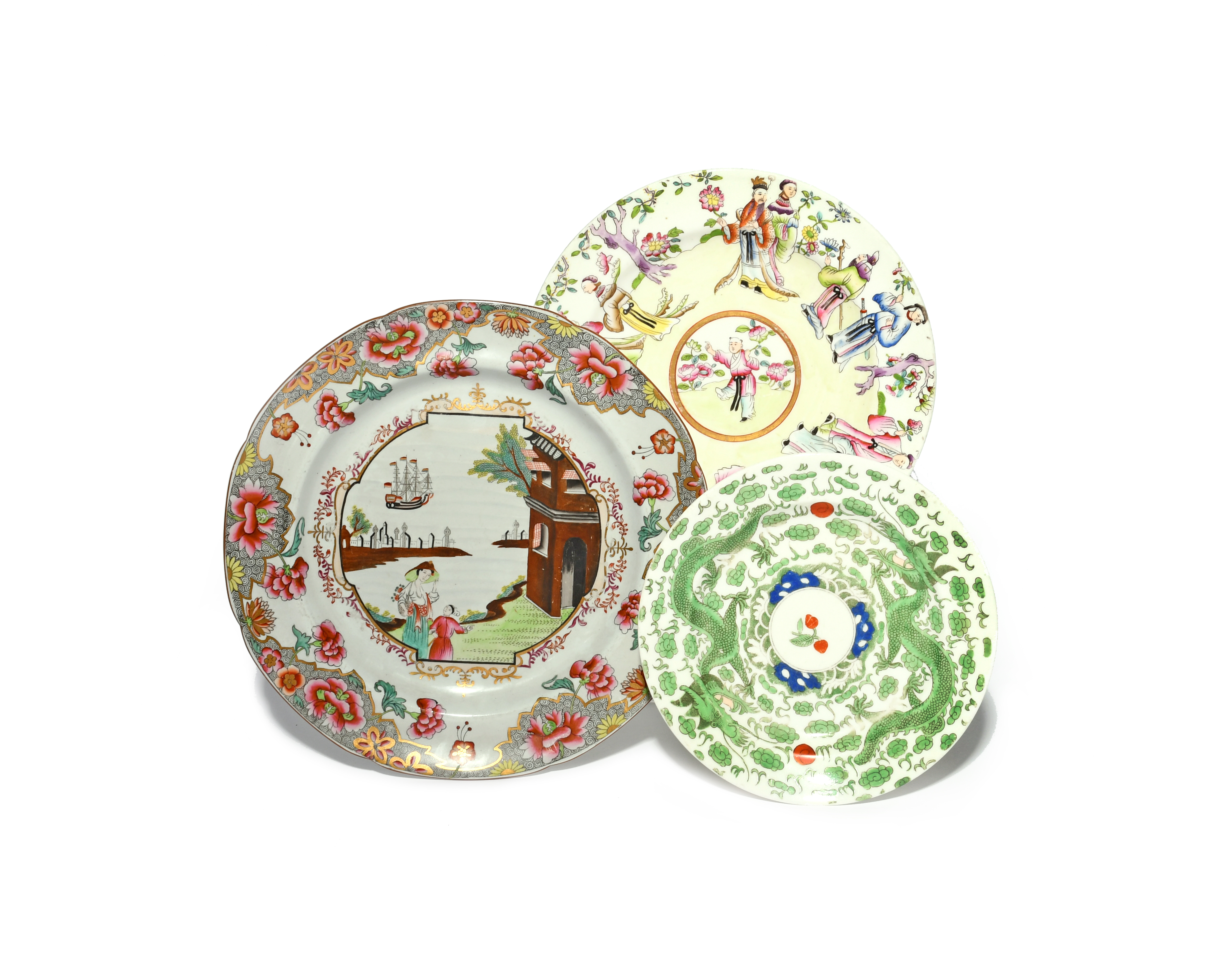 Three Spode plates of Oriental design 19th century, one stone china and decorated with the Ship pattern of a mother and child in an island landscape, a Felspar porcelain plate printed and hand-coloured with Chinese figures, and another decorated with confronting dragons chasing flaming pearls among cloud scrolls, 24.5cm max. (3)