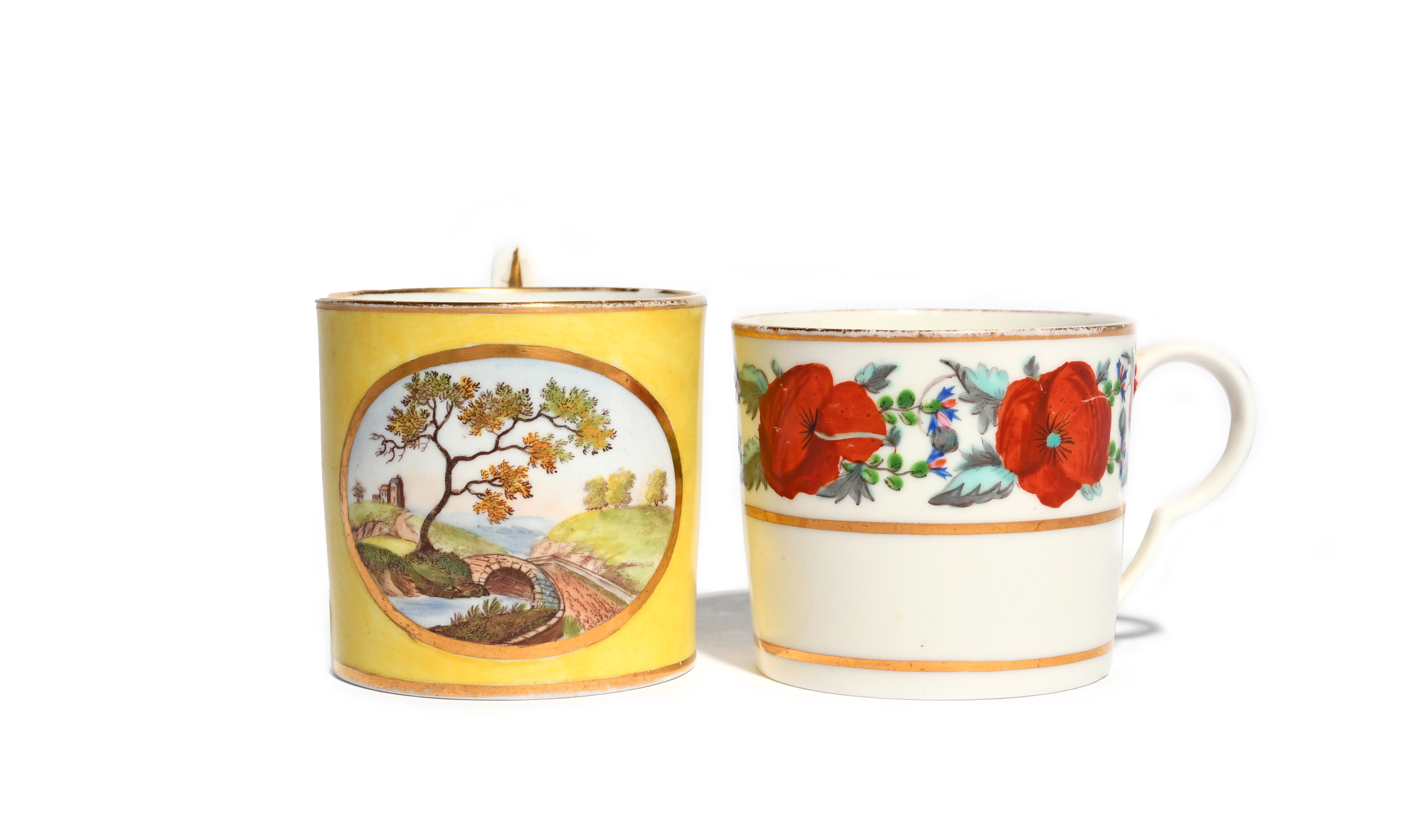 A Pinxton coffee can c.1800, painted with a wide border of red poppy and blue cornflower, and a Derby coffee can painted with a panel of a bridge over a river reserved on a yellow ground, titled to the underside 'Near Madely, Shropshire', iron red crowned crossed batons and D mark, 7cm max. (2)