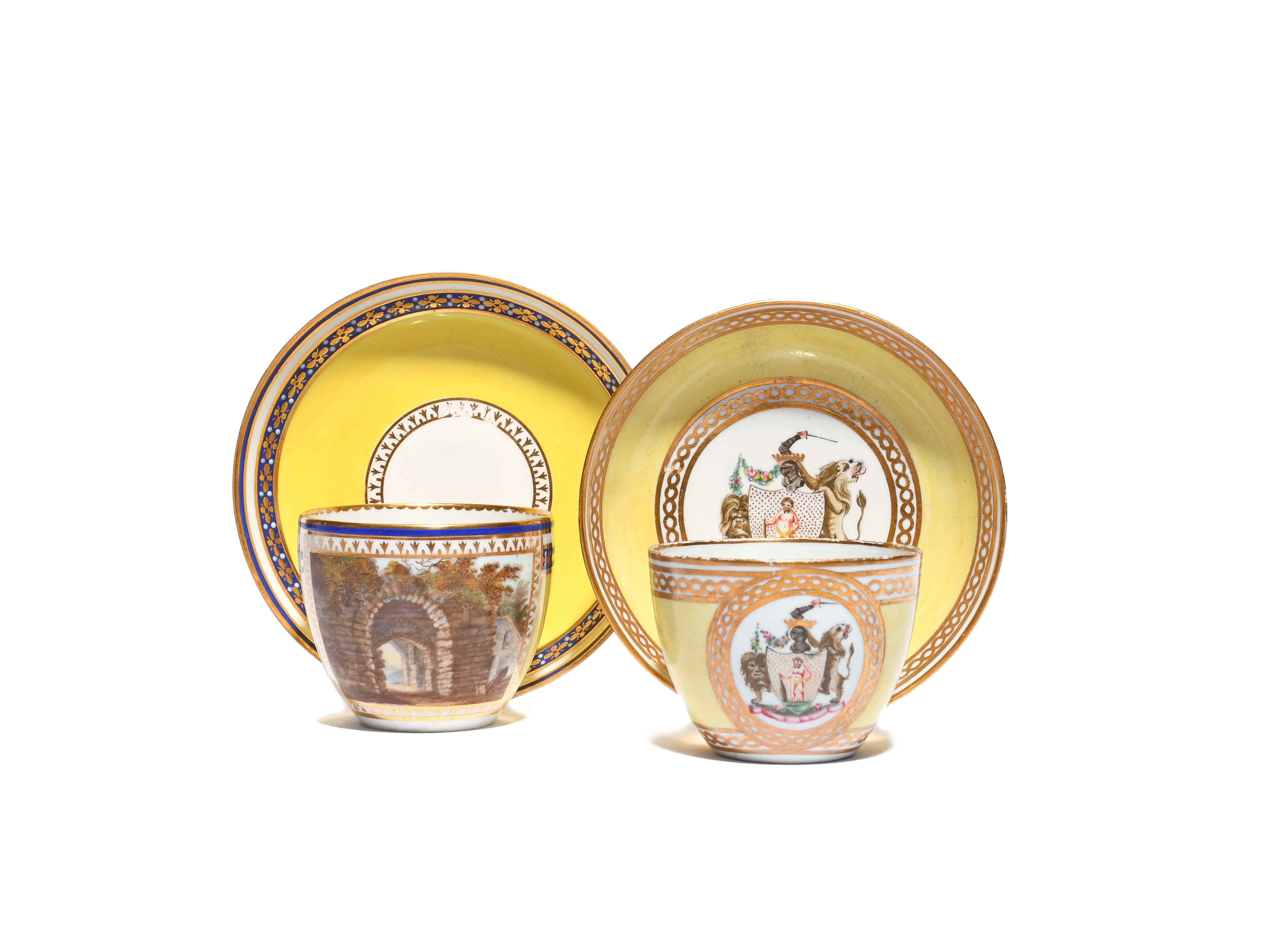 A Coalport armorial teacup and saucer c.1805, decorated with lions flanking a shield, and a Derby teabowl and saucer painted with a view of an Etruscan gateway in Volterra, Italy, titled in blue to the base, both reserved on yellow grounds, 14cm max. (4)