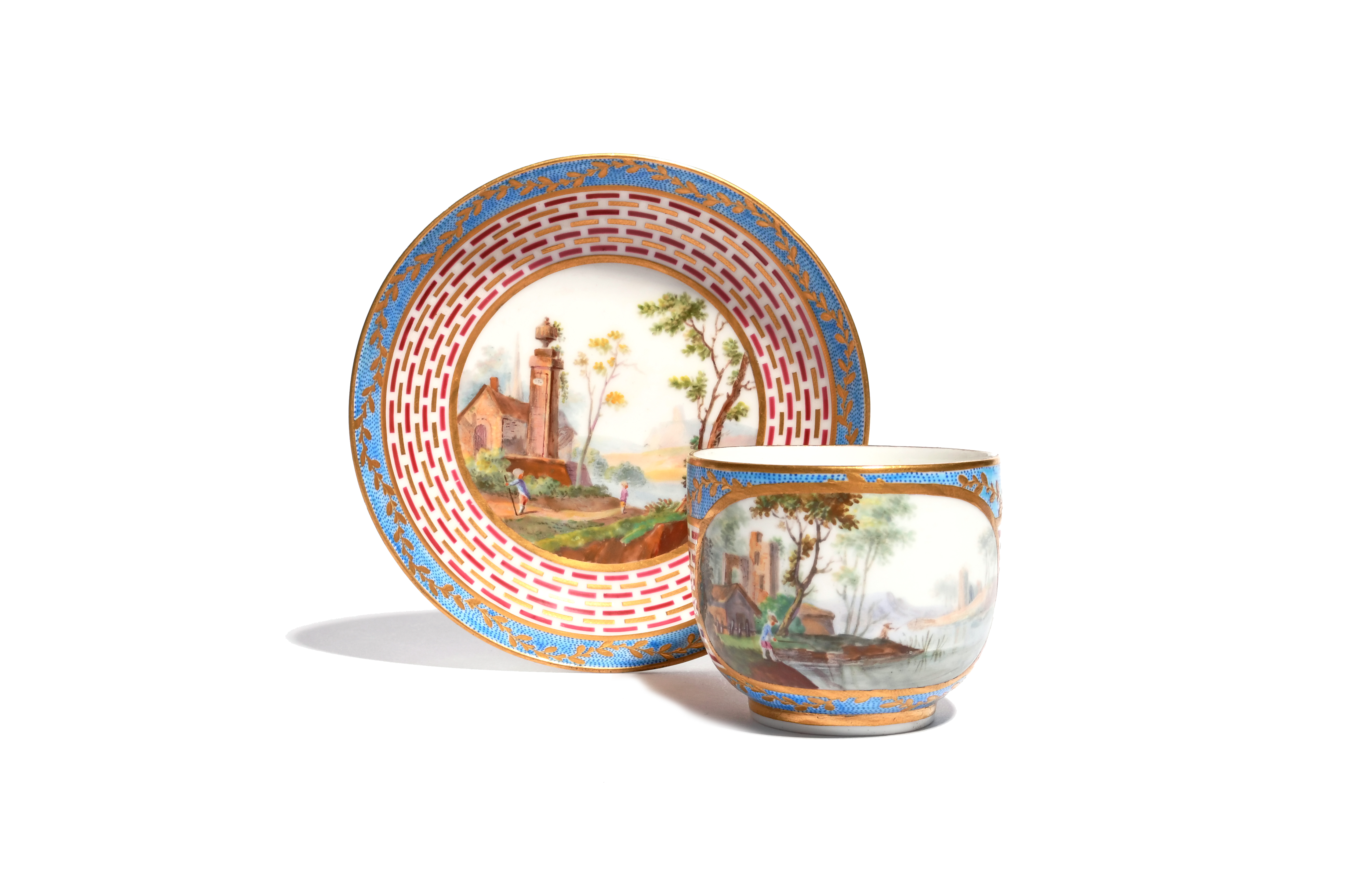 A Sèvres cup and saucer (gobelet bouillard et soucoupe) date code for 1770, painted with panels of figures fishing and walking before buildings and trees in rural landscapes, reserved on a brickwork ground in red and gilt within blue pointille borders with gilt leaf bands, blue interlaced Ls marks, 13.5cm. (2)