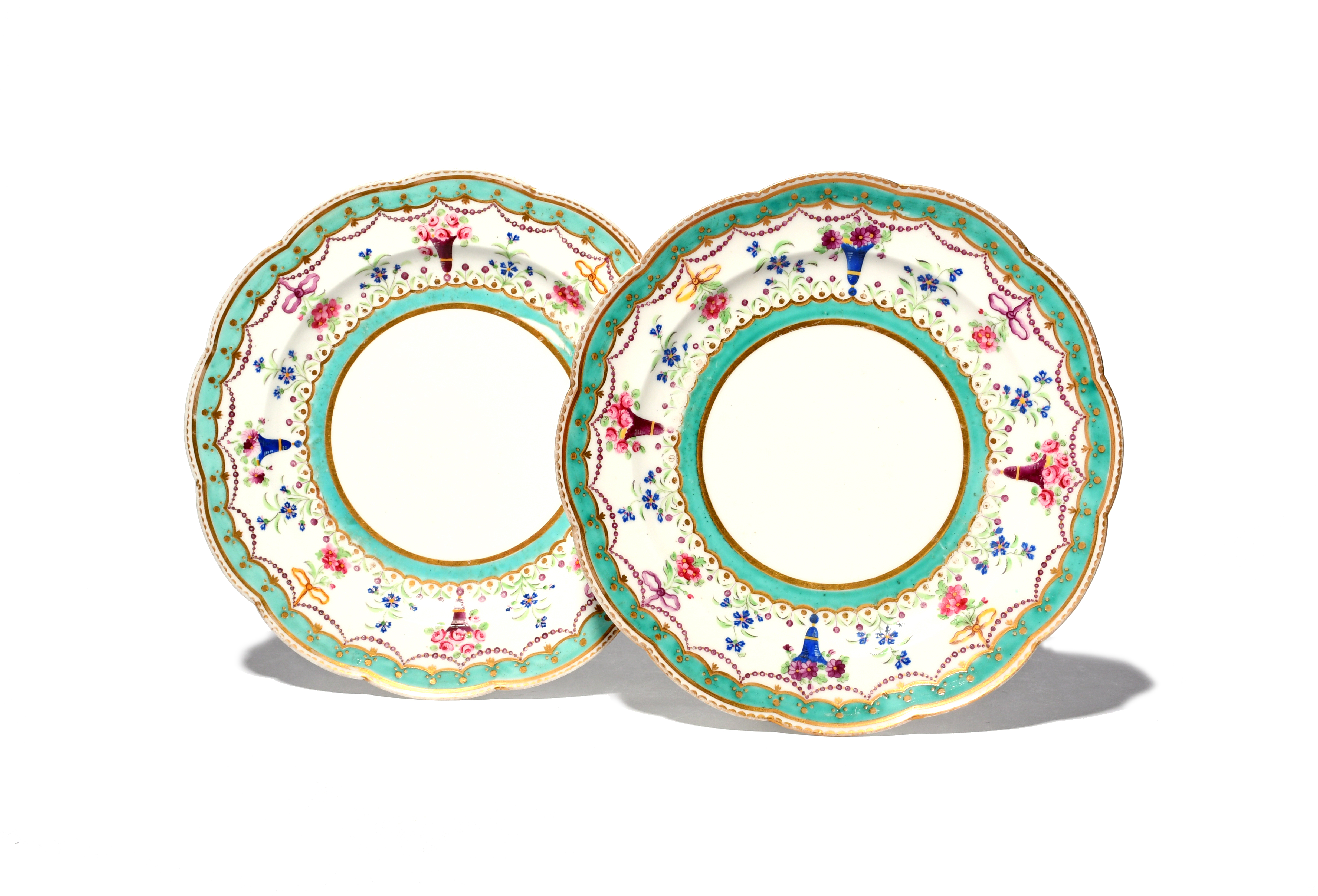 A pair of small Sèvres plates date codes for 1787, painted with vases of flowers issuing from a turquoise border, alternating with cornflower sprigs and suspended posies of tied pink flowers, blue interlaced Ls mark, letter code KK and painter's mark f, gilder's mark fin, 21cm. (2)