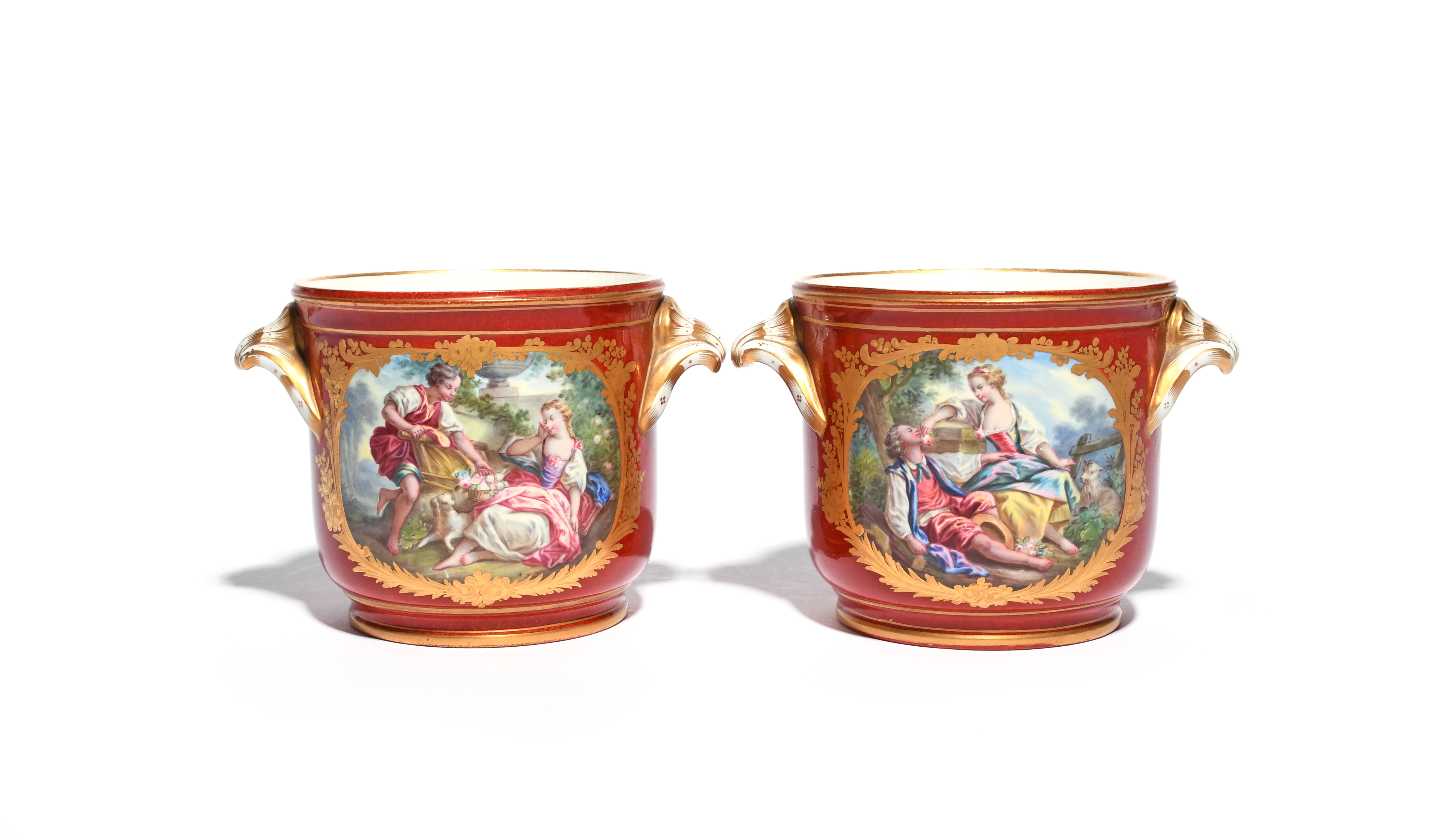A pair of Sèvres-style câchepots or coolers late 18th/19th century, each painted with a scene of a courting couple in the manner of Boucher, the reverses with a panel of flowers and fruit, reserved within foliate gilt borders on an orange-red ground, blue interlaced Ls mark enclosing letter O, 10.8cm high. (2)