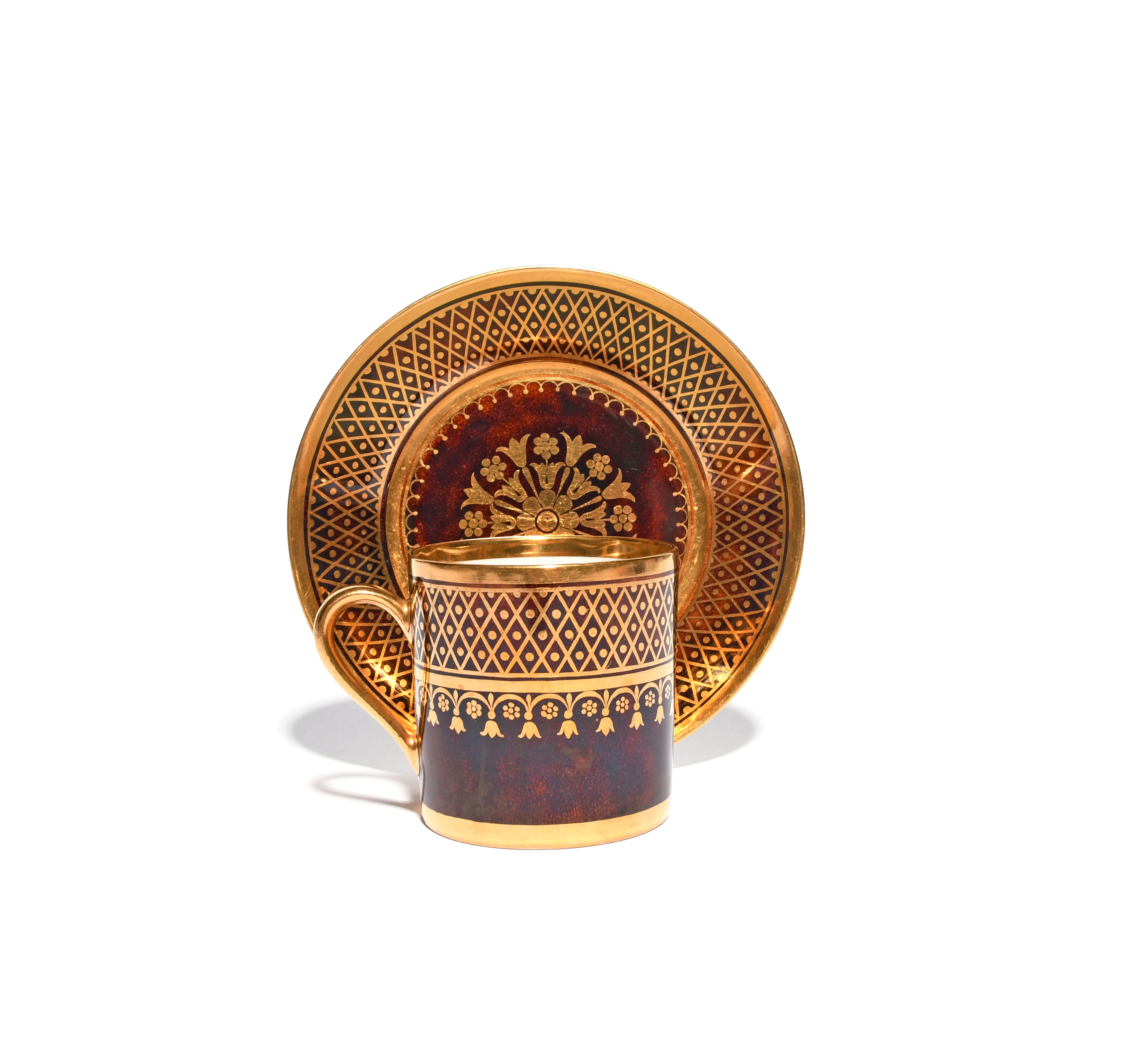 A Sèvres coffee can and saucer dated 1818, decorated with a formal gilt chequered design suspending small tassels, reserved on a brown tortoiseshell ground, printed marks, inscribed '18 Avril BT 18' to the footrims, 13.3cm (2)