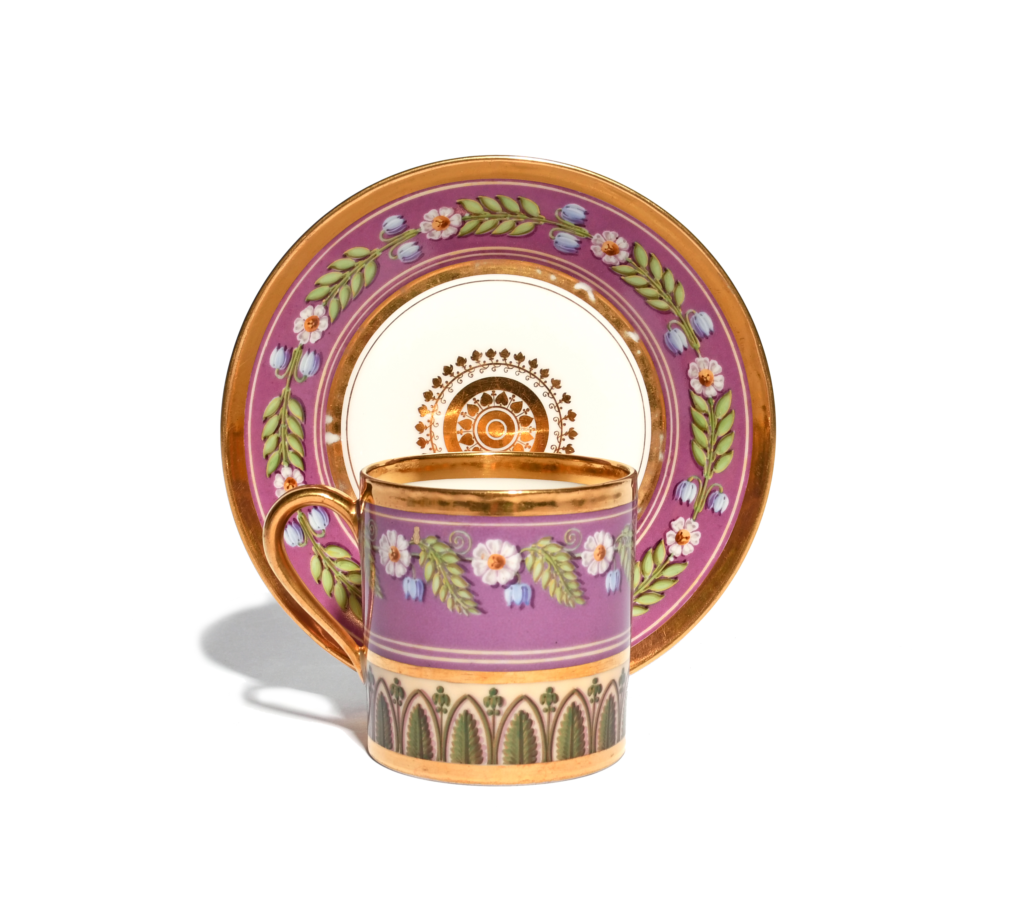 A Sèvres coffee can and saucer c.1814-18, painted with a formal band of bluebells and daisies with leaf husks reserved on a puce band, printed marks, 13.3cm. (2)