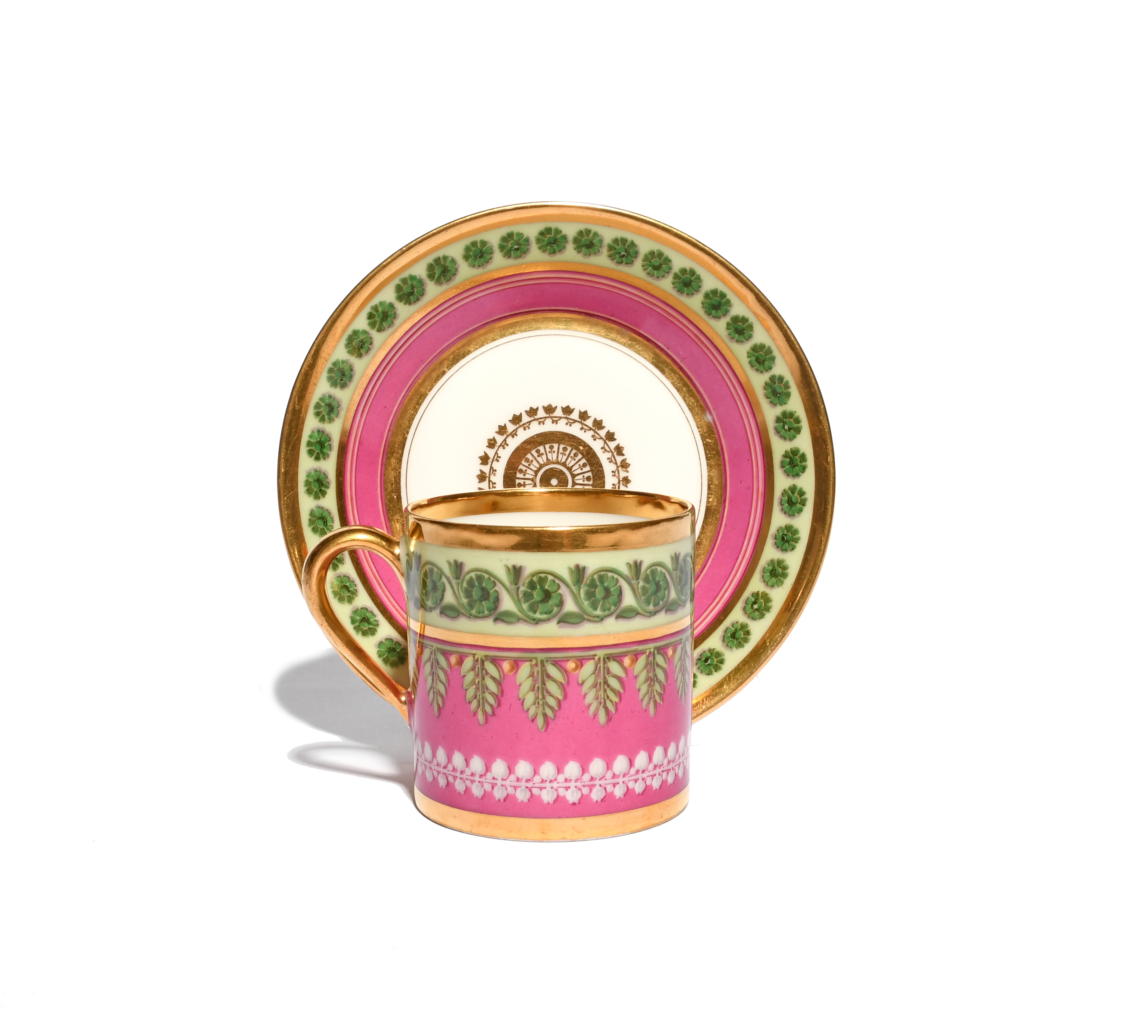 A Sèvres coffee can and saucer c.1814-18, decorated with green camaieu flowerheads and a stiff leaf band on a dark pink ground, printed marks, 13.4cm. (2)