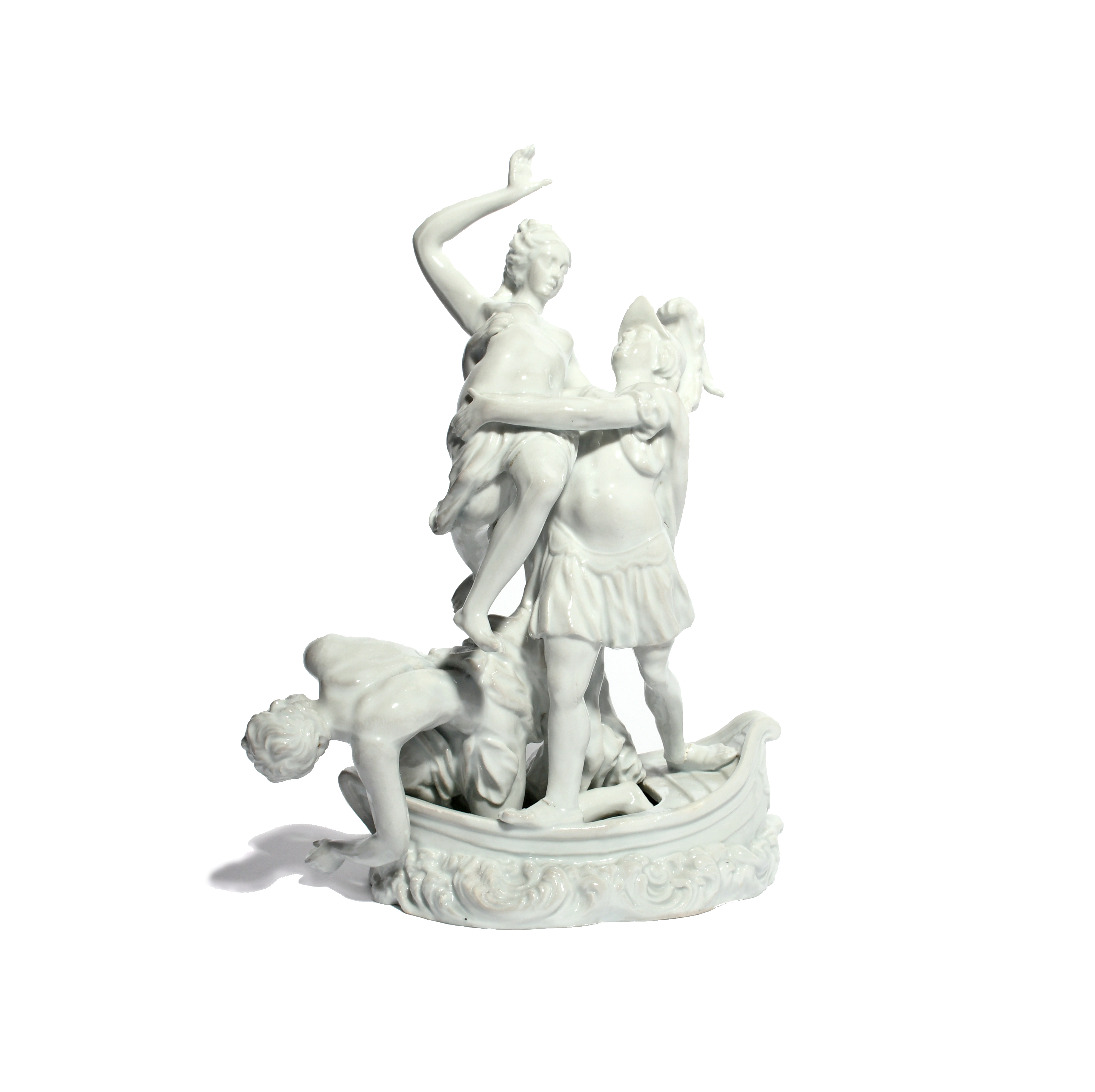An Italian porcelain white-glazed figure group 19th century, probably Naples, depicting the abduction of Helen of Troy, the unfortunate maiden struggling against her soldier captor while a sailor pushes the boat away from the shore, blue crowned N mark, 26.5cm.