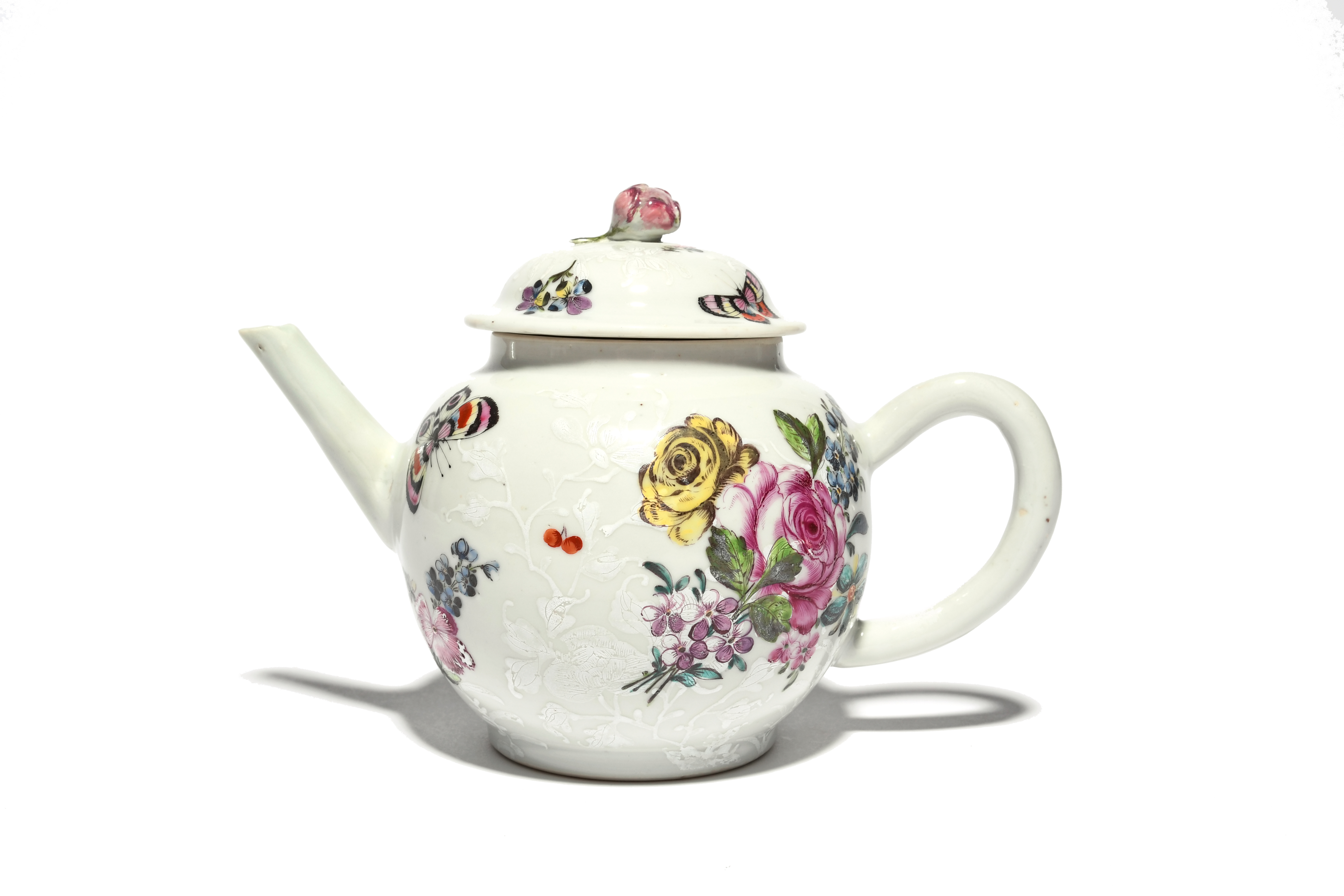 A London-decorated Chinese porcelain teapot and cover 18th century, originally decorated in bianco-sopra-bianco with flowering branches, later enamelled with colourful moths and butterflies in flight around floral arrangements including yellow and pink roses, the floral finial restored, 19.5cm. (2)
