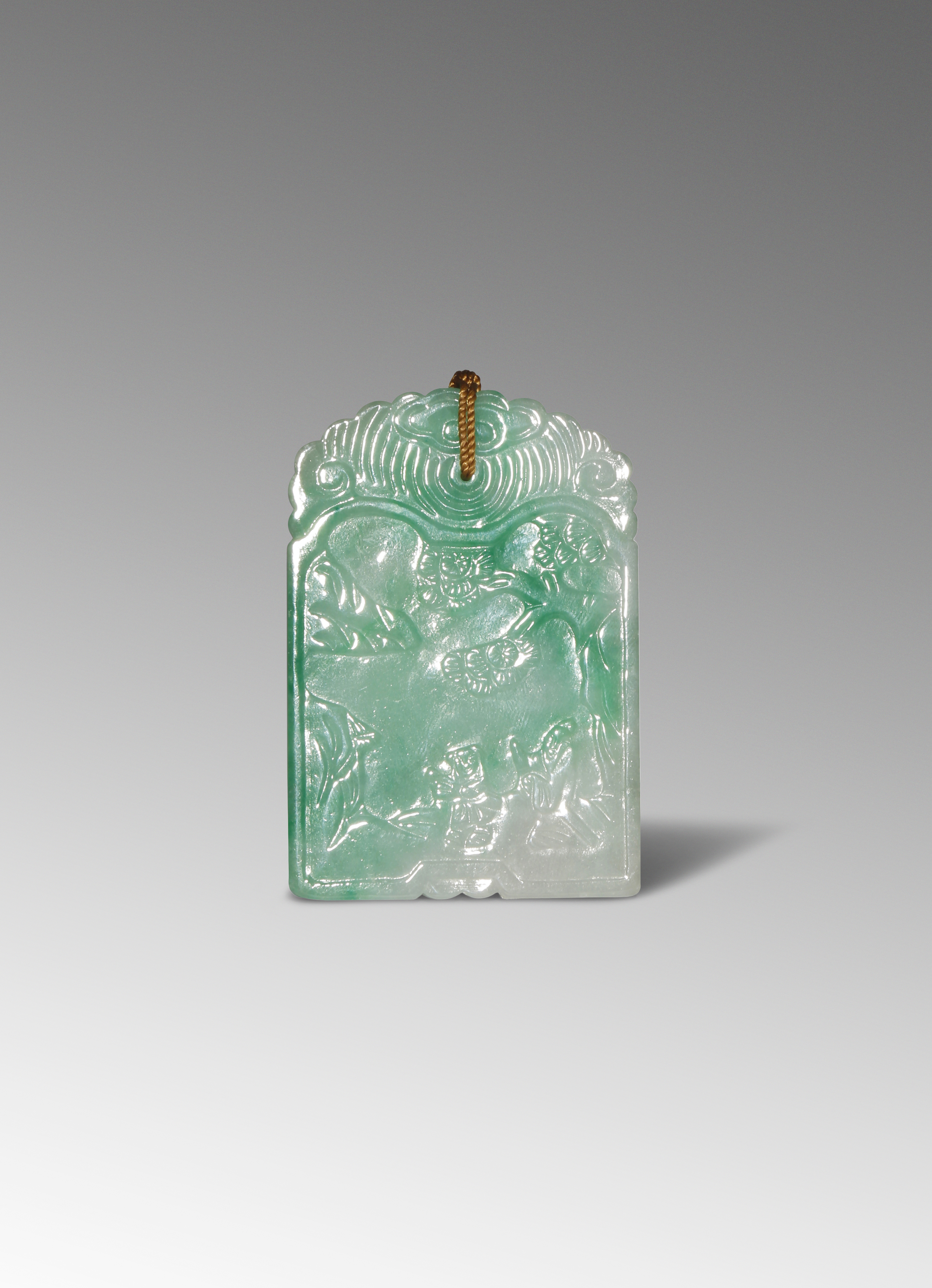 A CHINESE APPLE GREEN JADEITE RECTANGULAR PENDANT