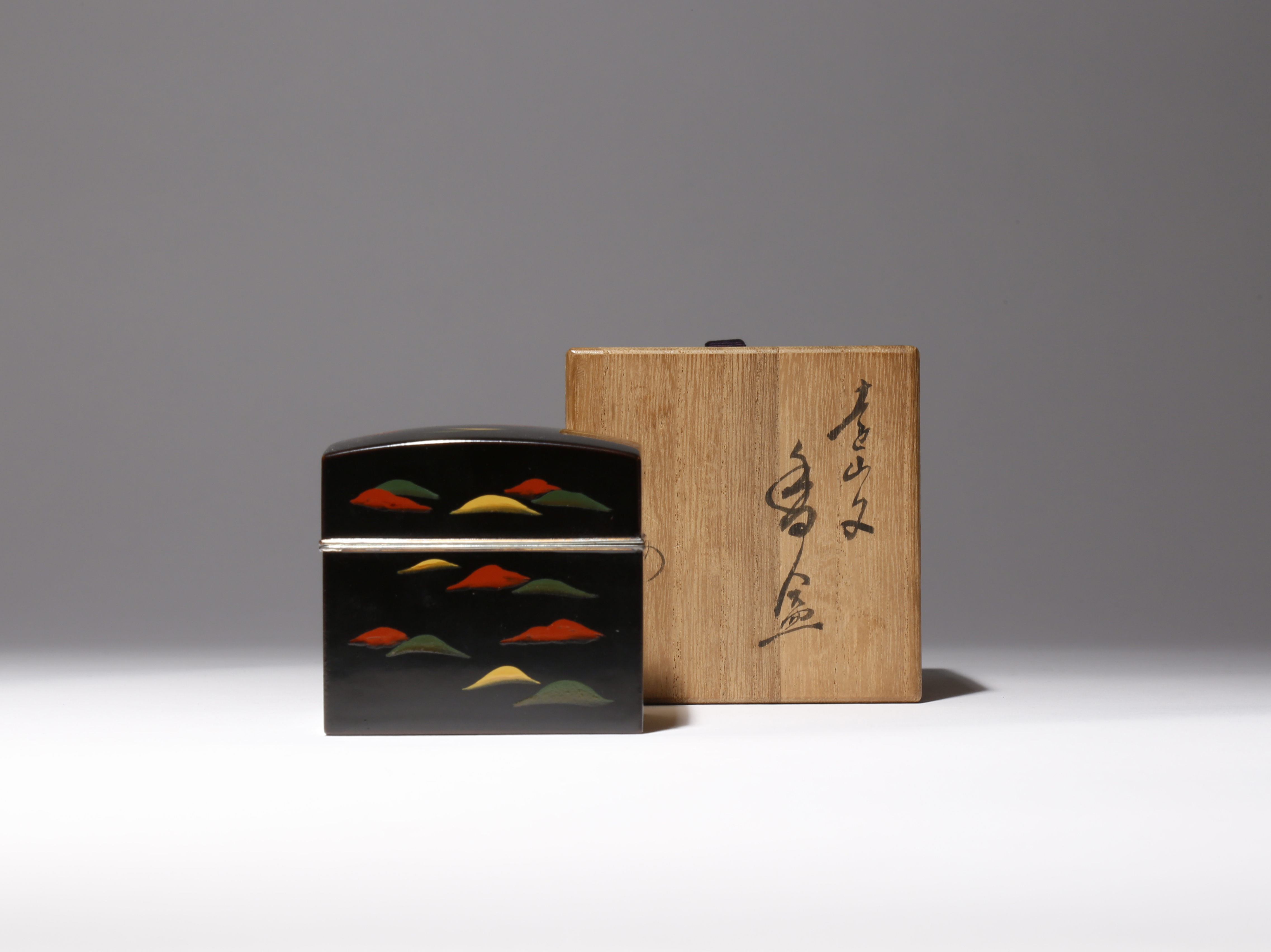 The square body in deep black lacquer decorated with abstract patterns reminiscent of mountains in ochre, iron-red and olive-green, the rim with silver-coloured mounts, the inside with nashiji gold lacquer and the underside of the lid painted with a Dharma Chakra (Wheel of Dharma) in gilt, in a fitted tomobako wood box and cover stamped with the elephant-shaped seal for the Zohiko workshop, 5.5cm x 6.1cm x 6.1cm.(4)