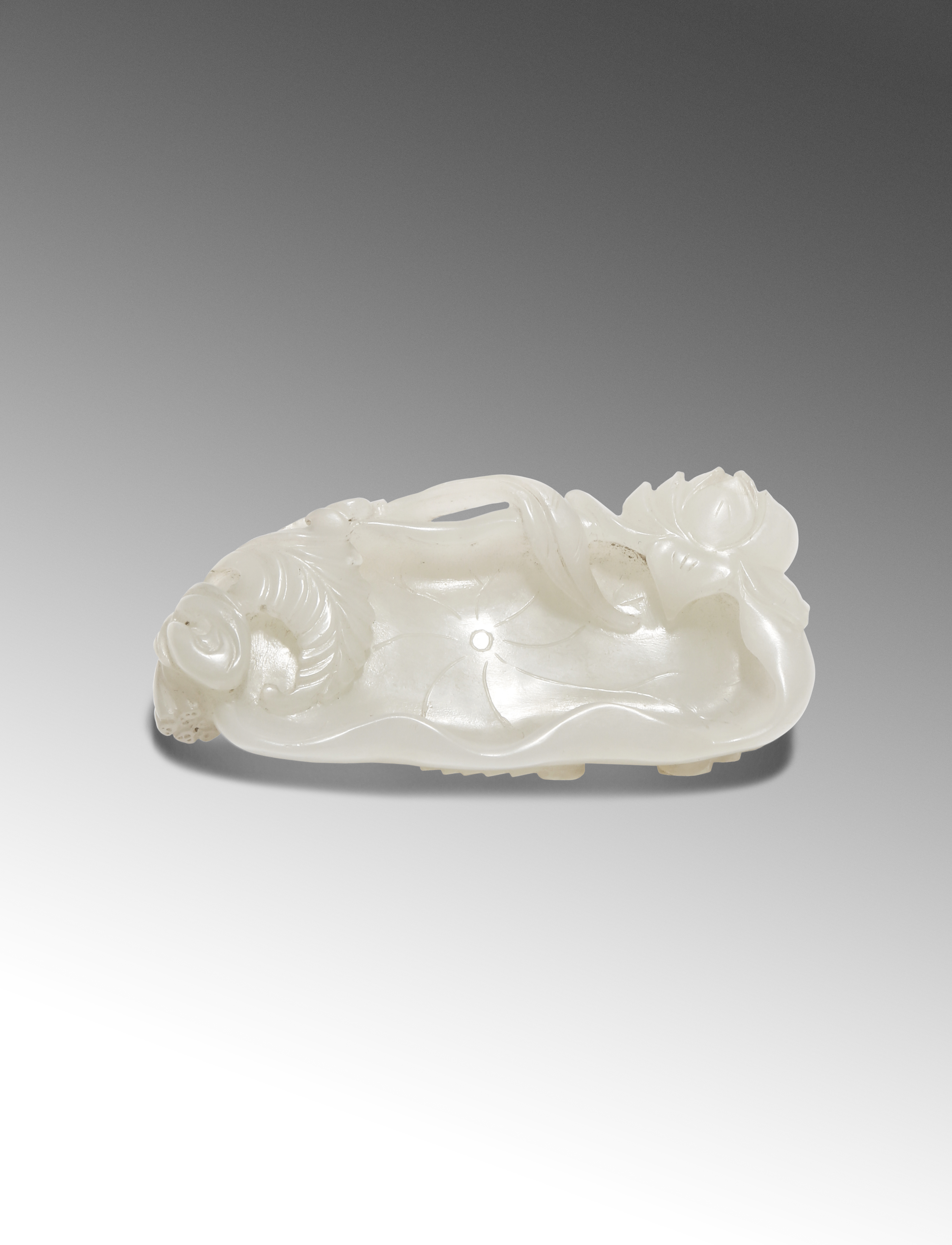 Carved as a lotus leaf furling at the edges, with a lotus flower and further leaves trailing underneath and over the edges, their stems all tied at the end, the pale stone of an even tone with some very small inclusions, 6.1cm.