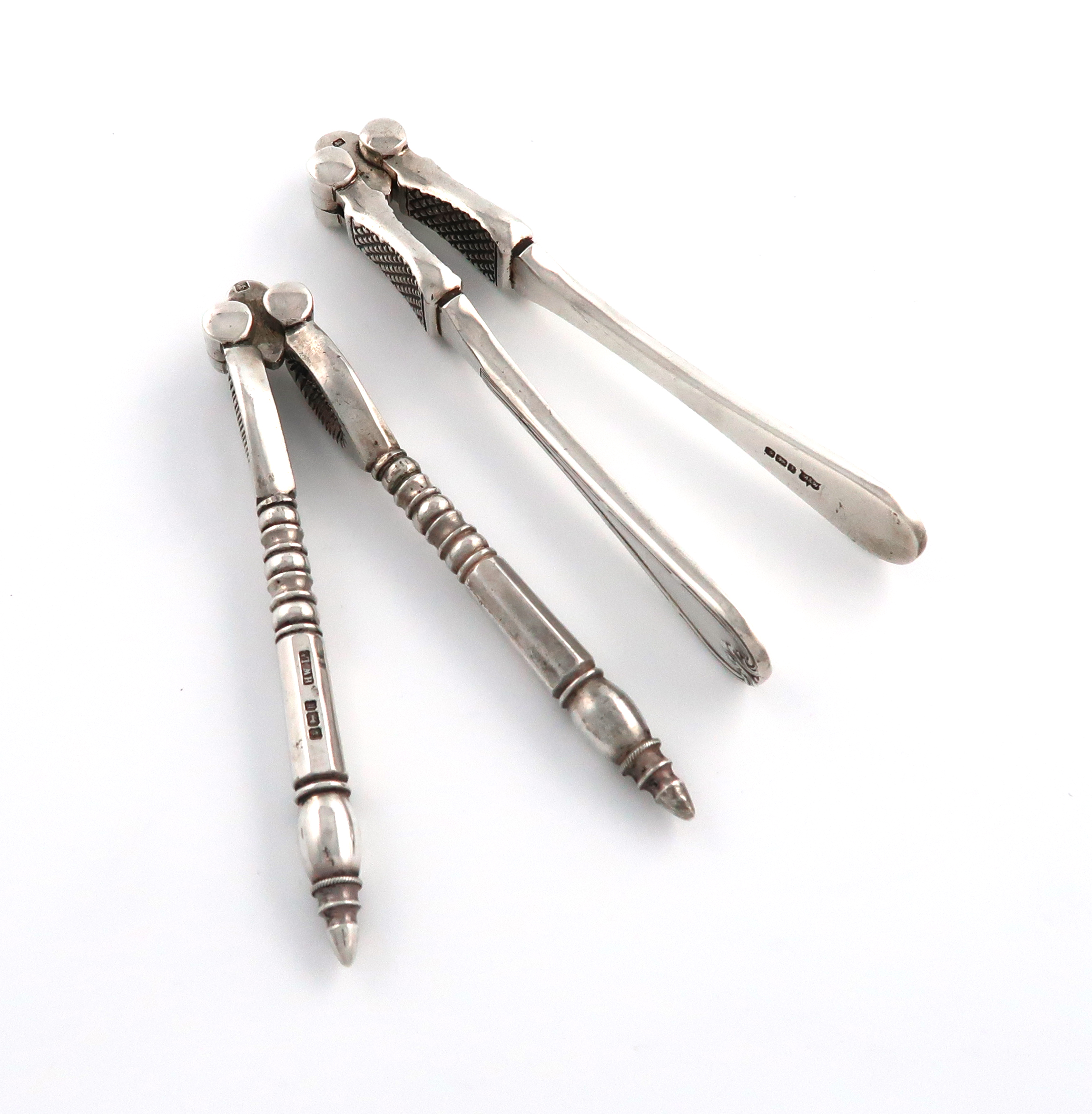 tapering faceted and baluster handles, length 13.5cm, plus another pair of silver nut crackers, by Mappin and Webb, Sheffield 1917, with ribbon and reed handles and foliate motifs, length 15.2cm. (2)