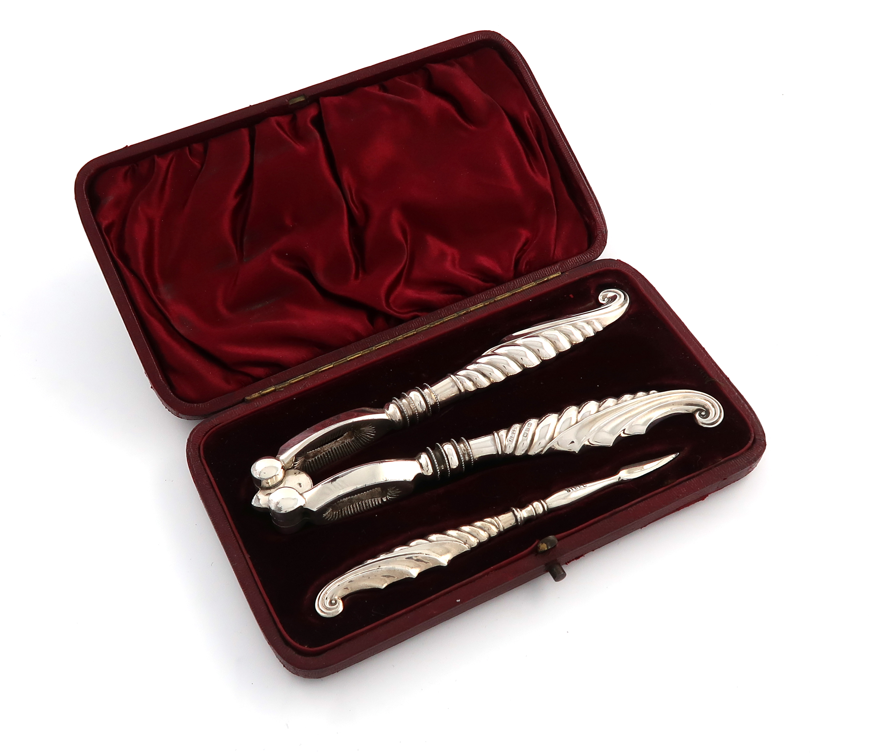 A pair of late-Victorian silver handled nut crackers and a nut pick