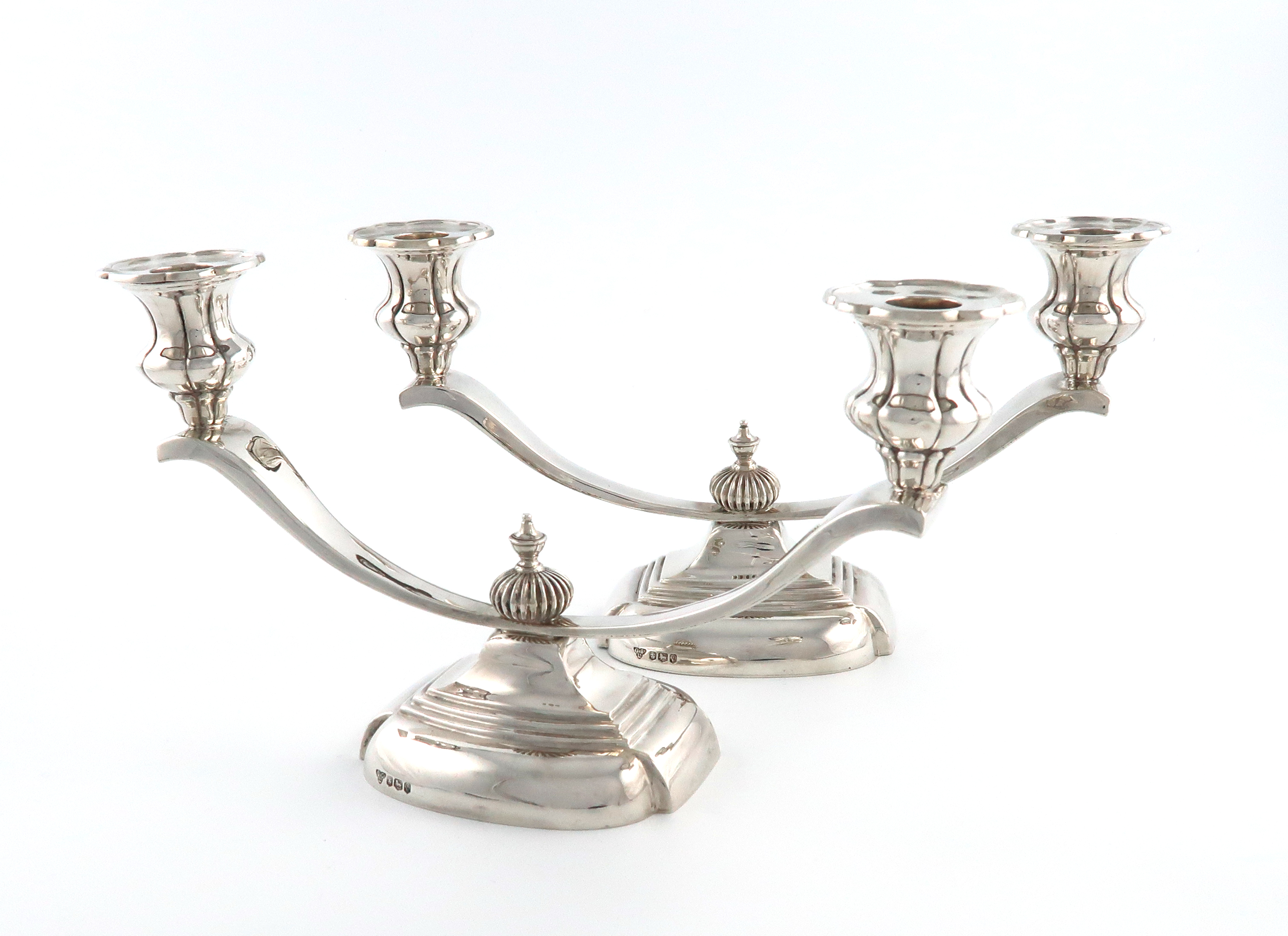 on raised shaped rectangular base, plain tapering arms each supporting an urn capital, with a central fluted finial, length 30.3cm, approx. weight 28oz. (2)