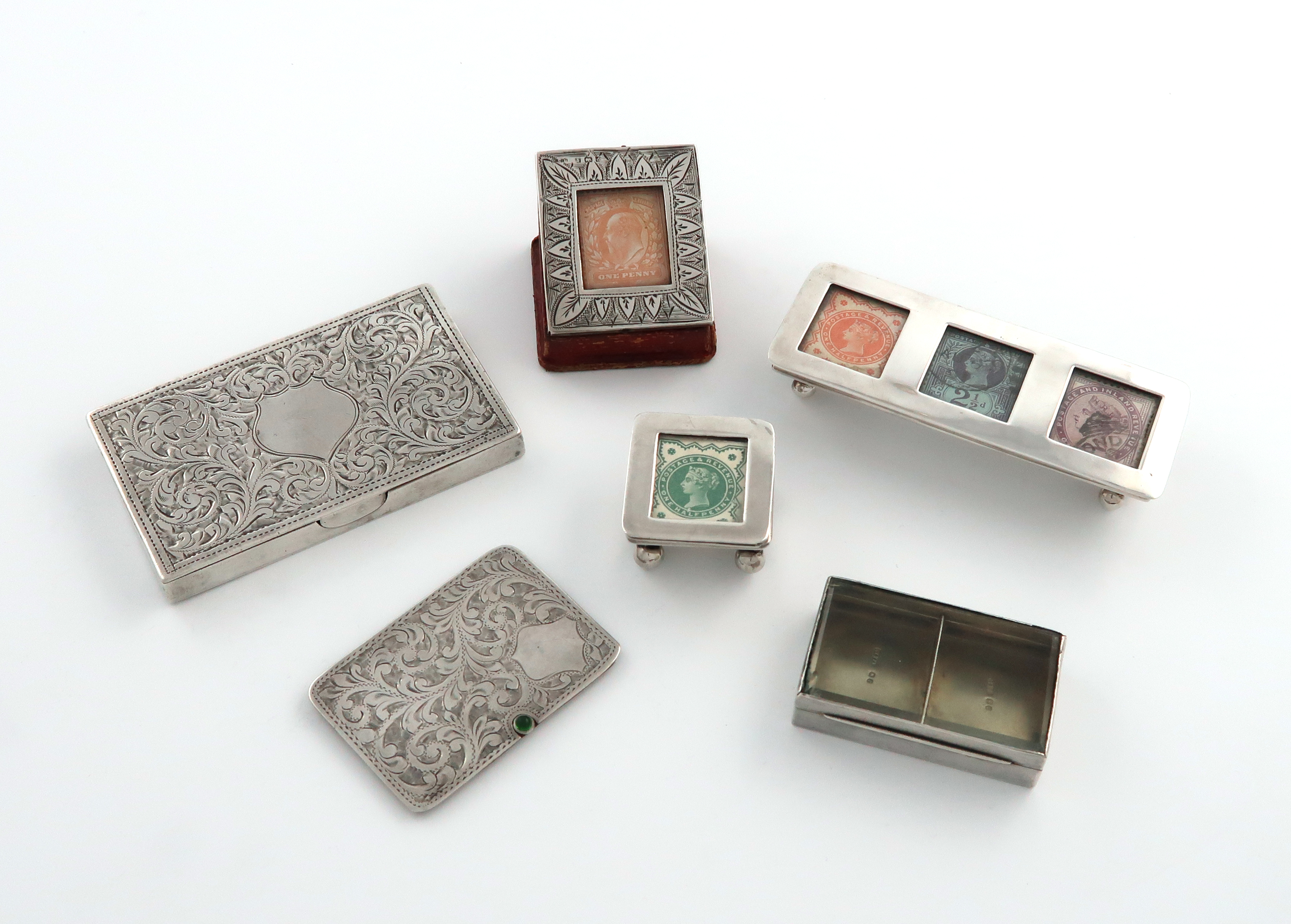 comprising: a late-Victorian triple box, by A and J Zimmerman, Birmingham 1899, rectangular form, the hinged cover set with three stamps under glass, length 8.8cm, plus two single stamp boxes, a double box with a hinged glass cover, by Saunders and Shepherd, Chester 1898, a double slide-action case, with engraved decoration, and an Edwardian box, the hinged cover set with two stamp compartments, Birmingham 1901. (6)