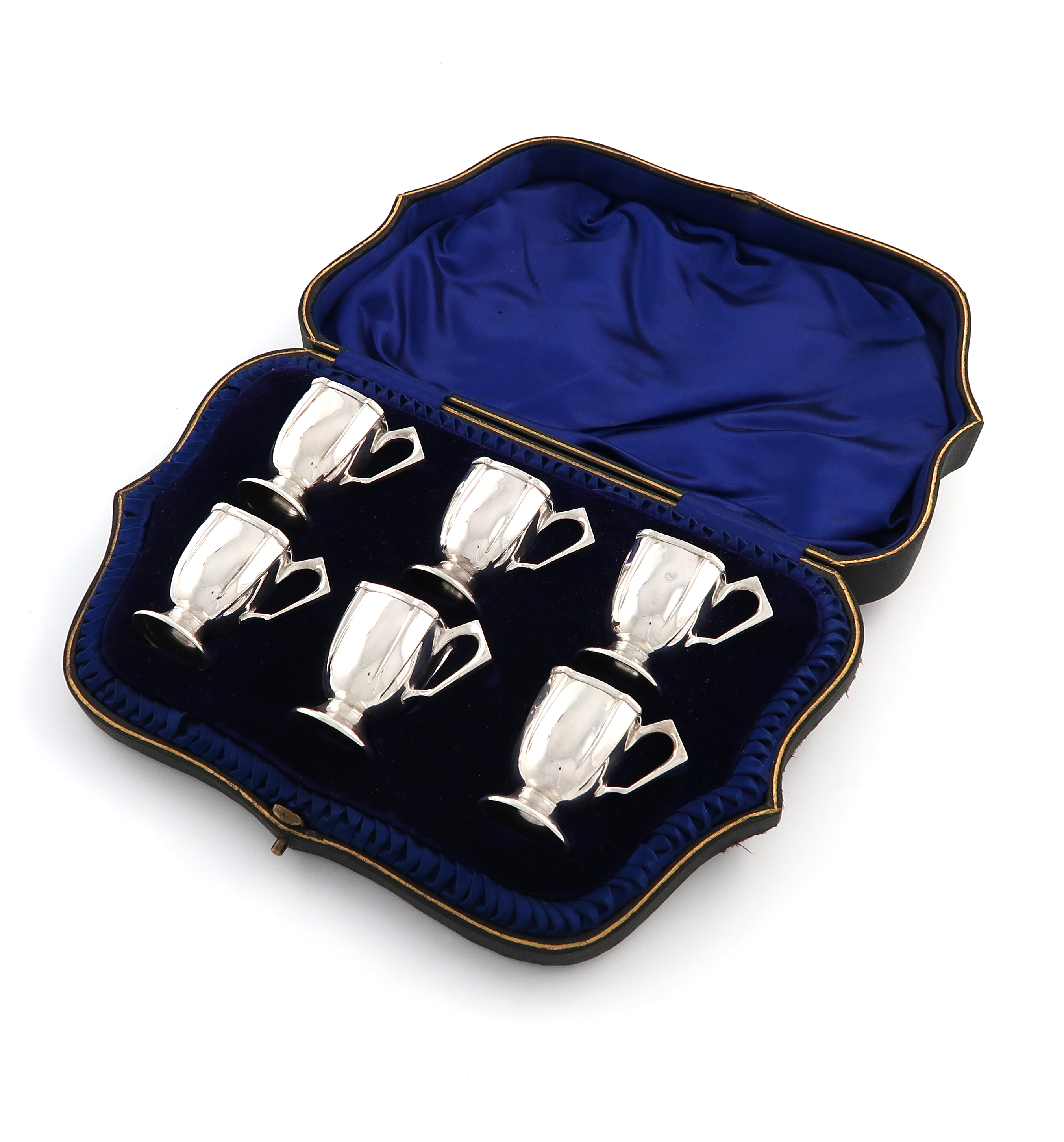 shaped tapering square form, scroll handles, gilded interiors, on circular bases, in a fitted case, height 4.7cm, approx. weight 4oz. (6)