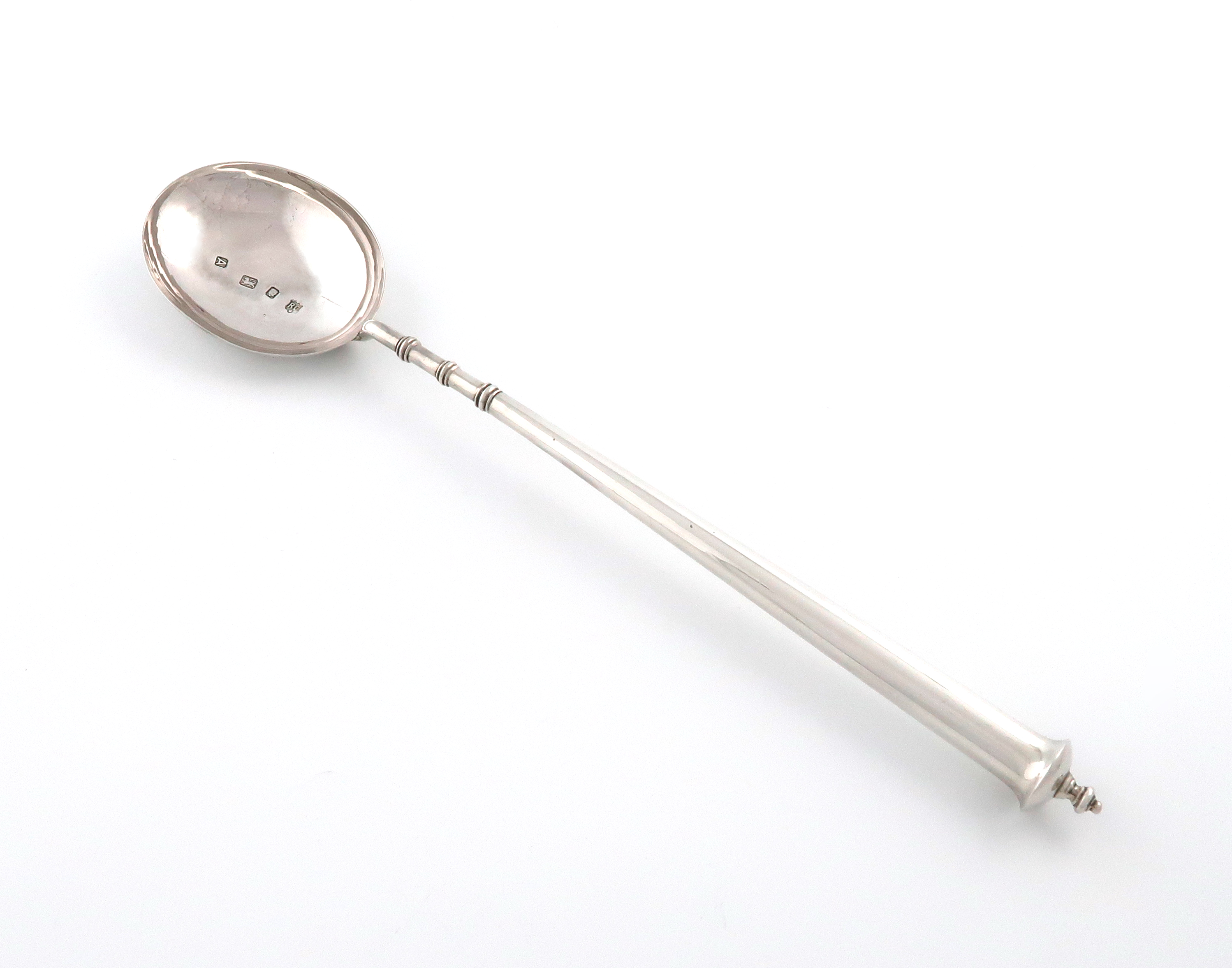 tapering circular handle, with a knop finial, the reverse of the oval bowl with two crests and inscribed 'Copy of The Salisbury Ladle 1684, given to The Fishmongers Livery on the Coronation of King George VI, 12 May 1937', length 38.2cm, approx. weight 4.9oz.
