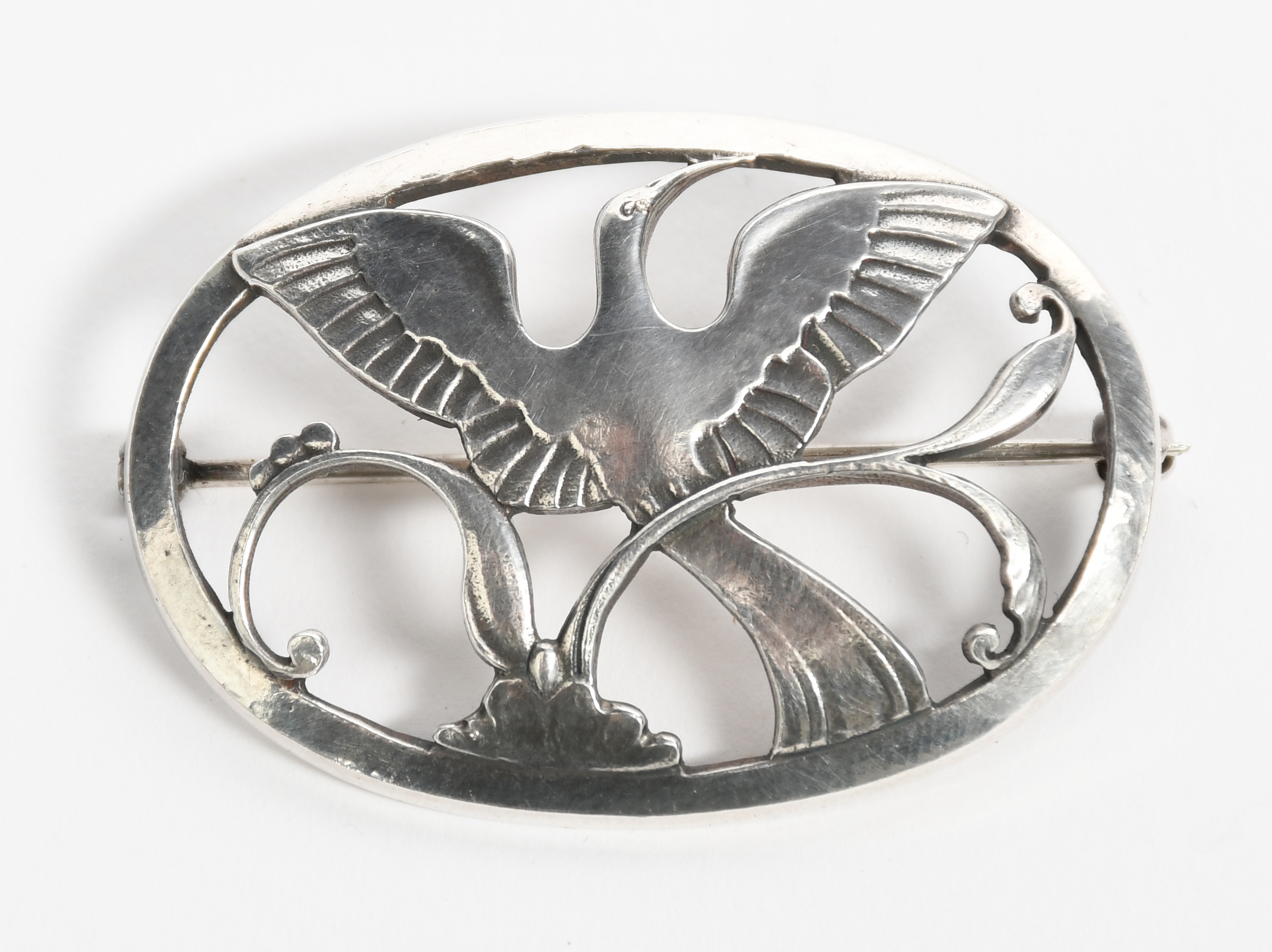 A Georg Jensen silver brooch designed by Arno Malinowski, model no.238, pierced and cast with an exotic bird flying over a large flower, stamped factory marks, 4.2cm. wide.