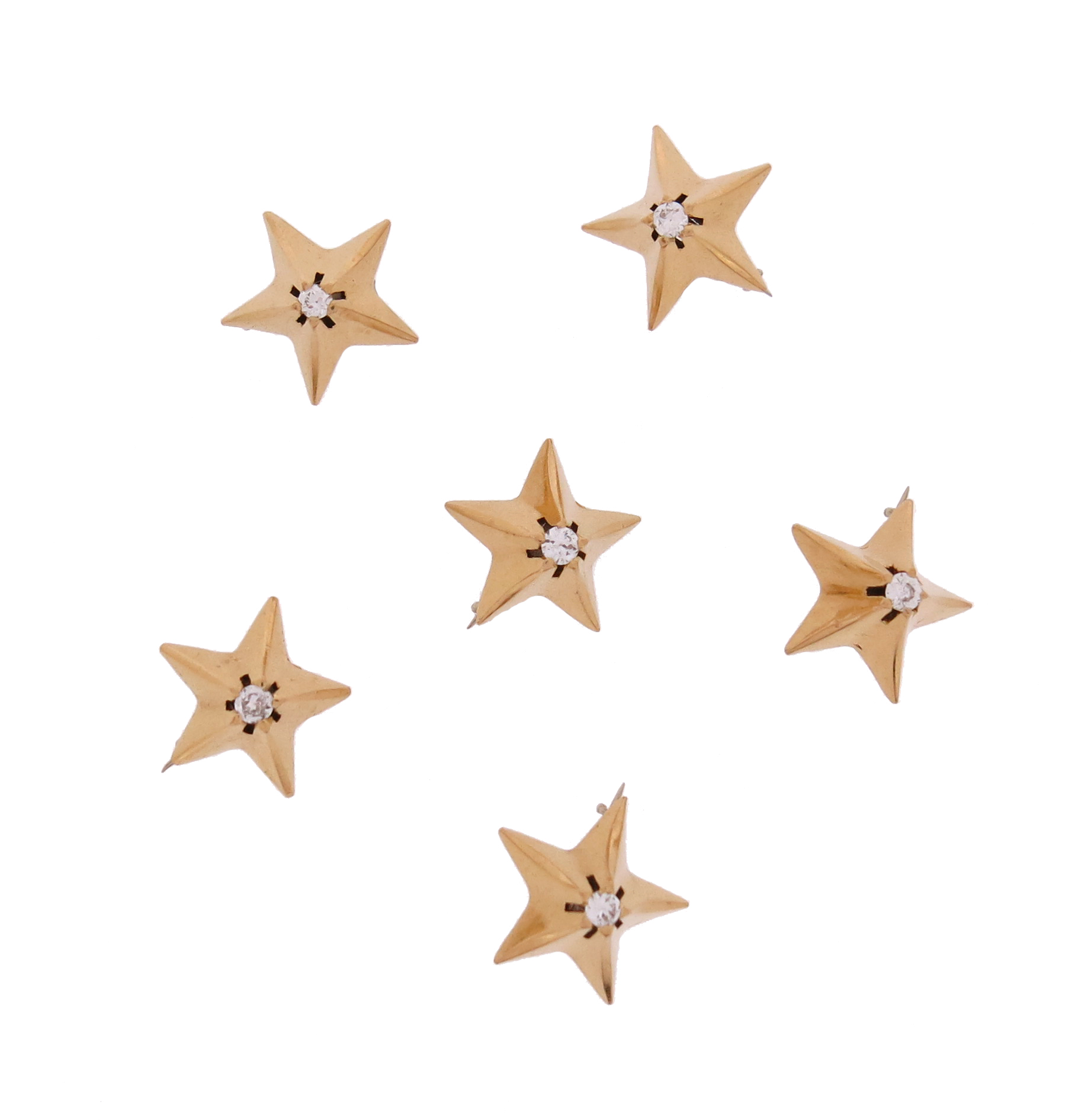 A set of six diamond-set gold star brooches, the three dimensional stars each set with an old circular-cut diamond in yellow gold, 16mm wide