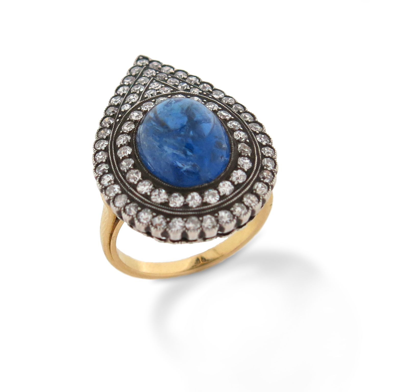 A tanzanite and diamond cluster ring, the tanzanite cabochon is set within teardrop surround set with single-cut diamonds in silver and gold, size M