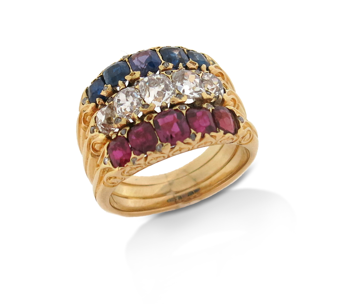 A late 19th century ruby sapphire and diamond ring, formed from three half hoop rings conjoined, each set with five stones and diamond pointers mounted in carved and pierced yellow gold, size M