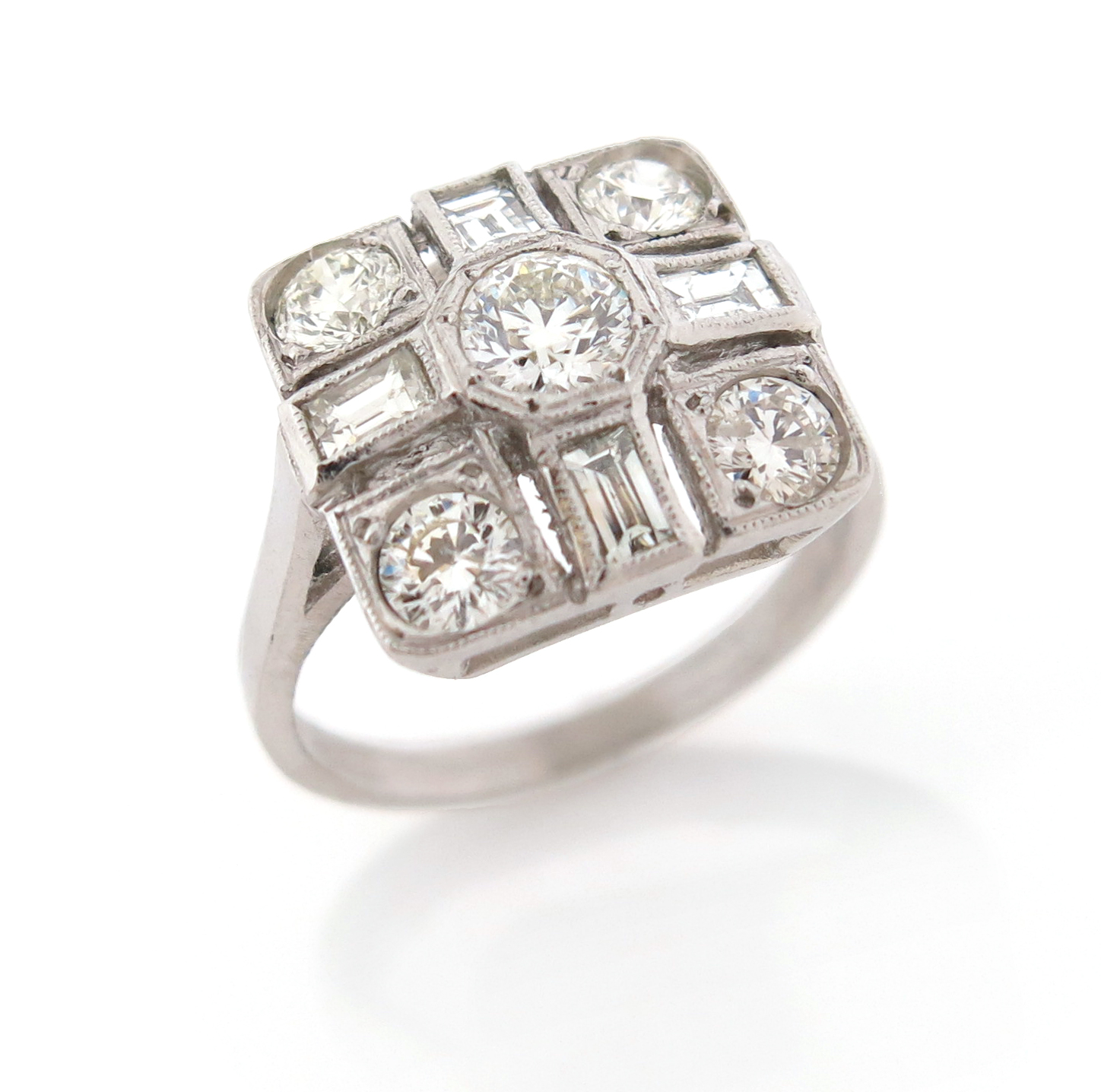 A square diamond cluster ring, millegrain-set with graduated round brilliant-cut and baguette-shaped diamonds in pierced white gold mount, size M 1/2