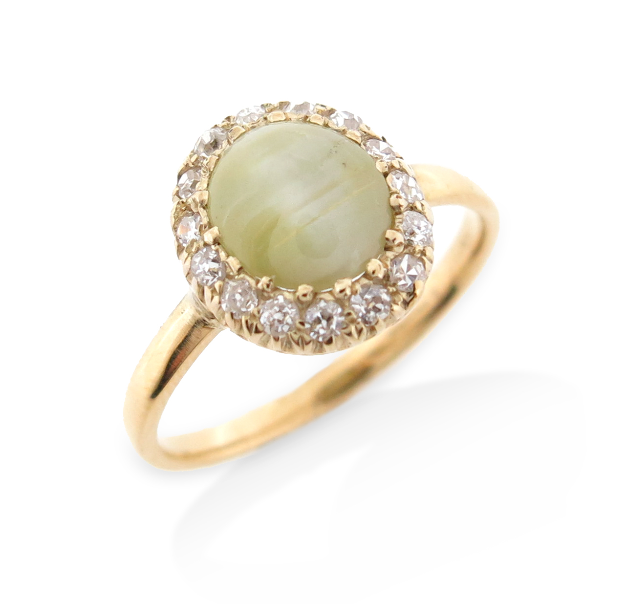 A chrysoberyl cat's eye and diamond cluster ring, the cabochon chrysoberyl set within a surround of circular-cut diamonds in yellow gold, size R