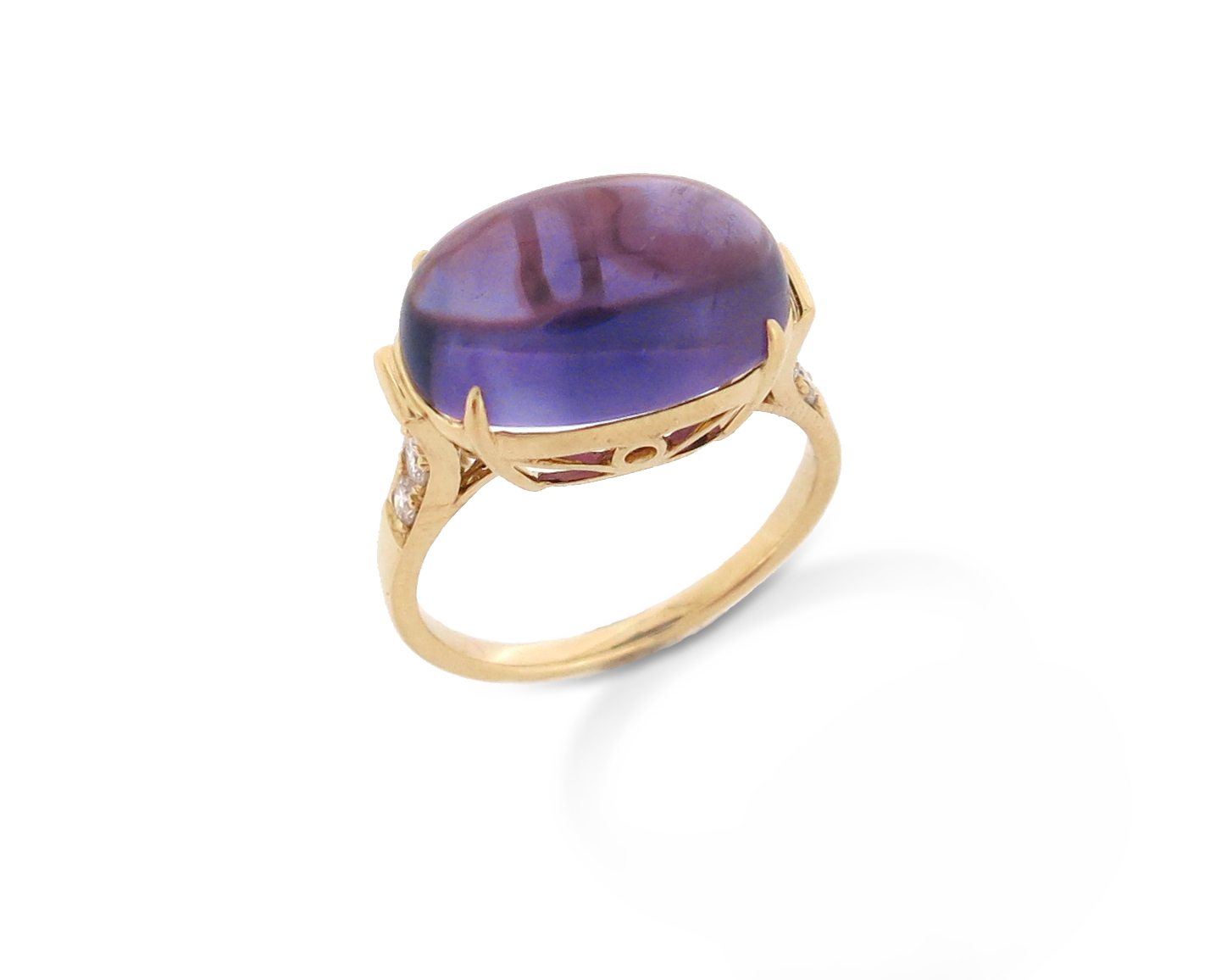 An amethyst and diamond ring, set with an amethyst cabochon, with graduated round brilliant-cut diamonds to the shoulders in gold, size M