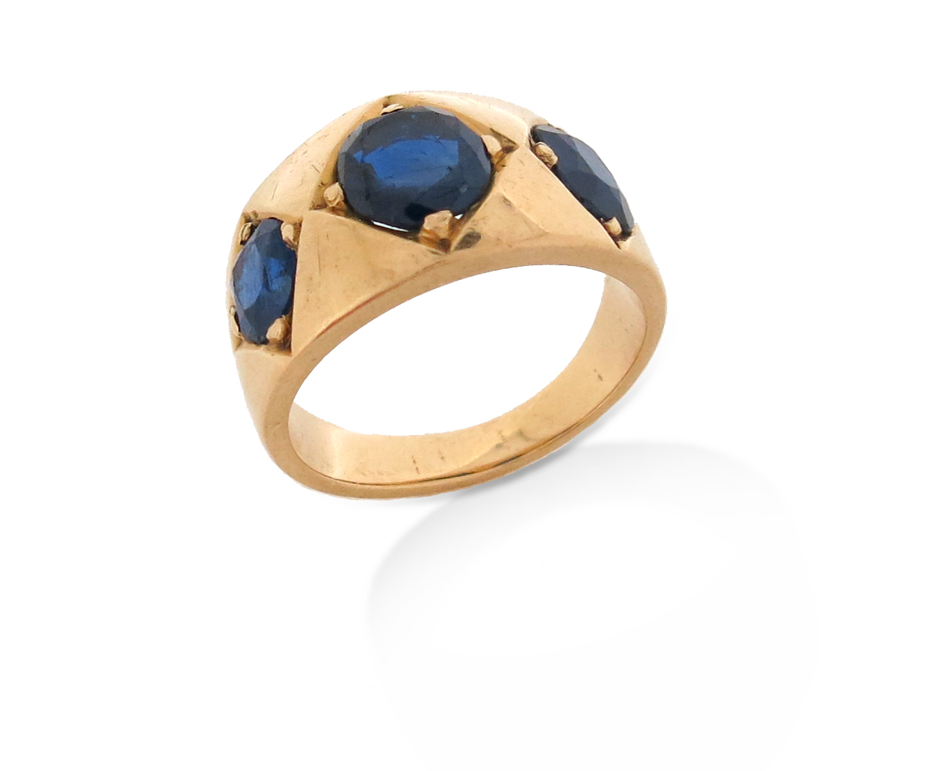 A sapphire three stone ring, the graduated oval-shaped sapphires set in rhomboid four claw yellow gold settings, size M 1/2