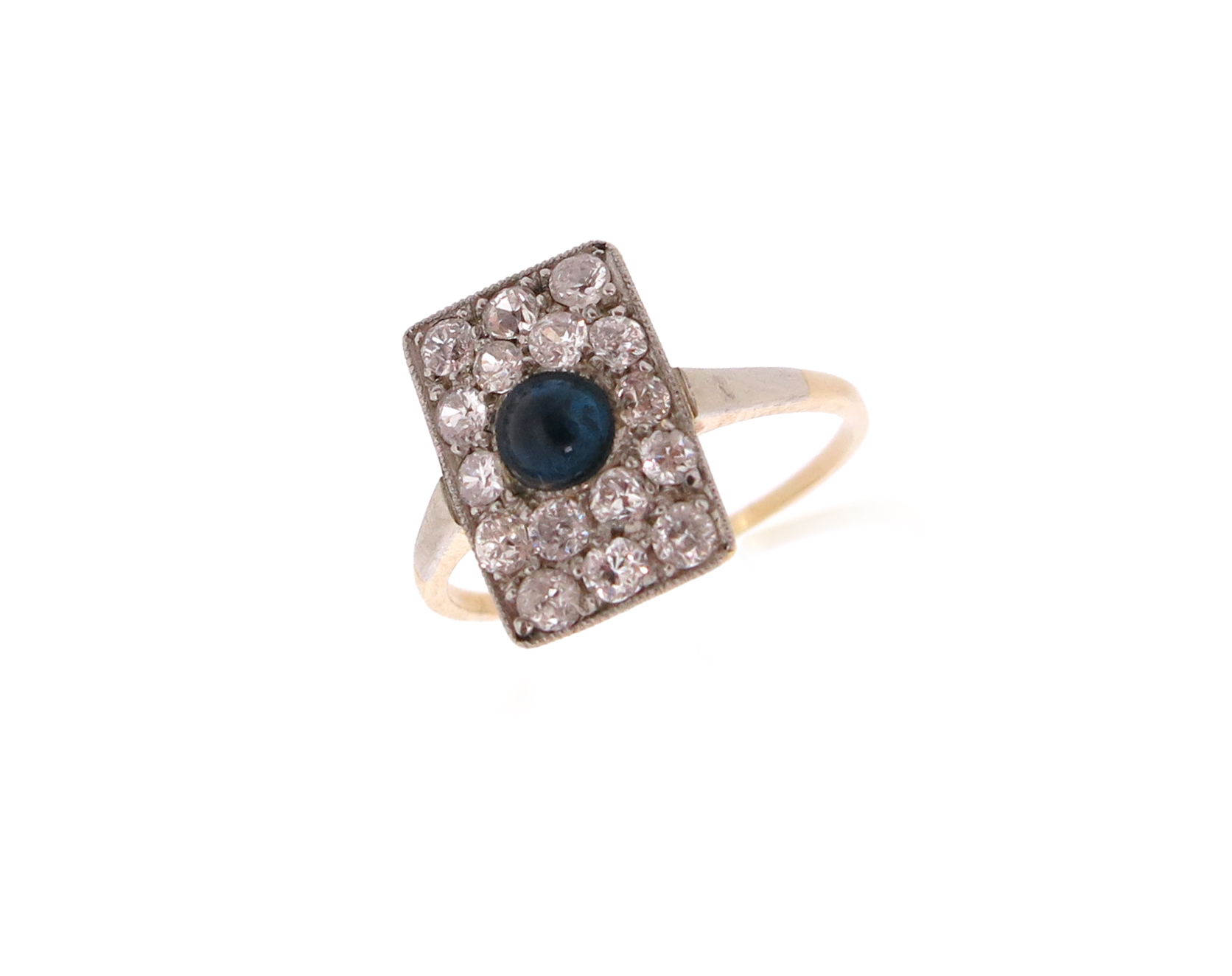 An Edwardian rectangular plaque ring, pave-set with graduated old cushion-shaped diamonds and a central blue glass cabochon in platinum and gold, size P