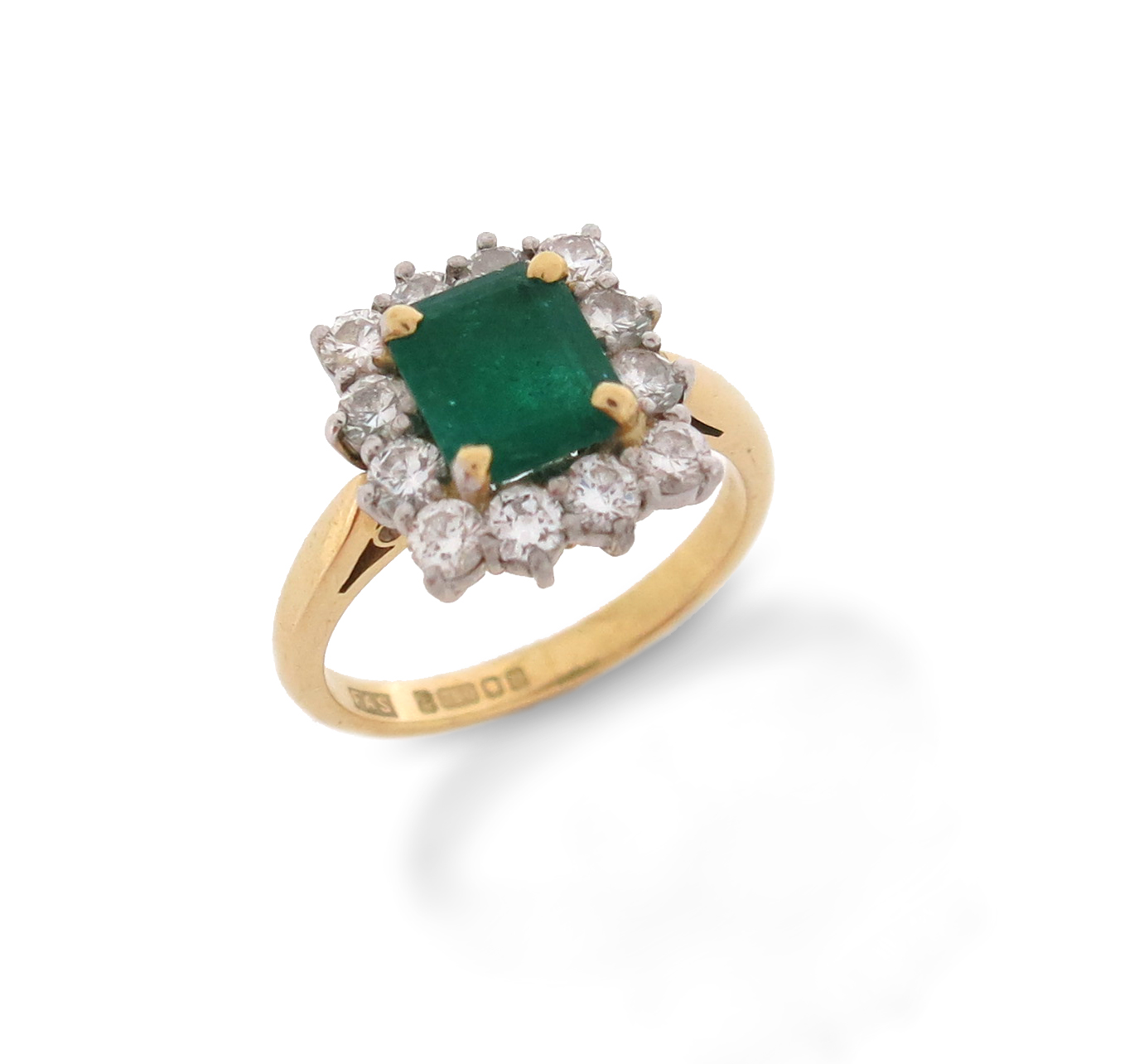 An emerald and diamond cluster ring, the emerald-cut emerald set within a surround of round brilliant-cut diamonds in 18ct yellow gold, London hallmarks for 1995, size K