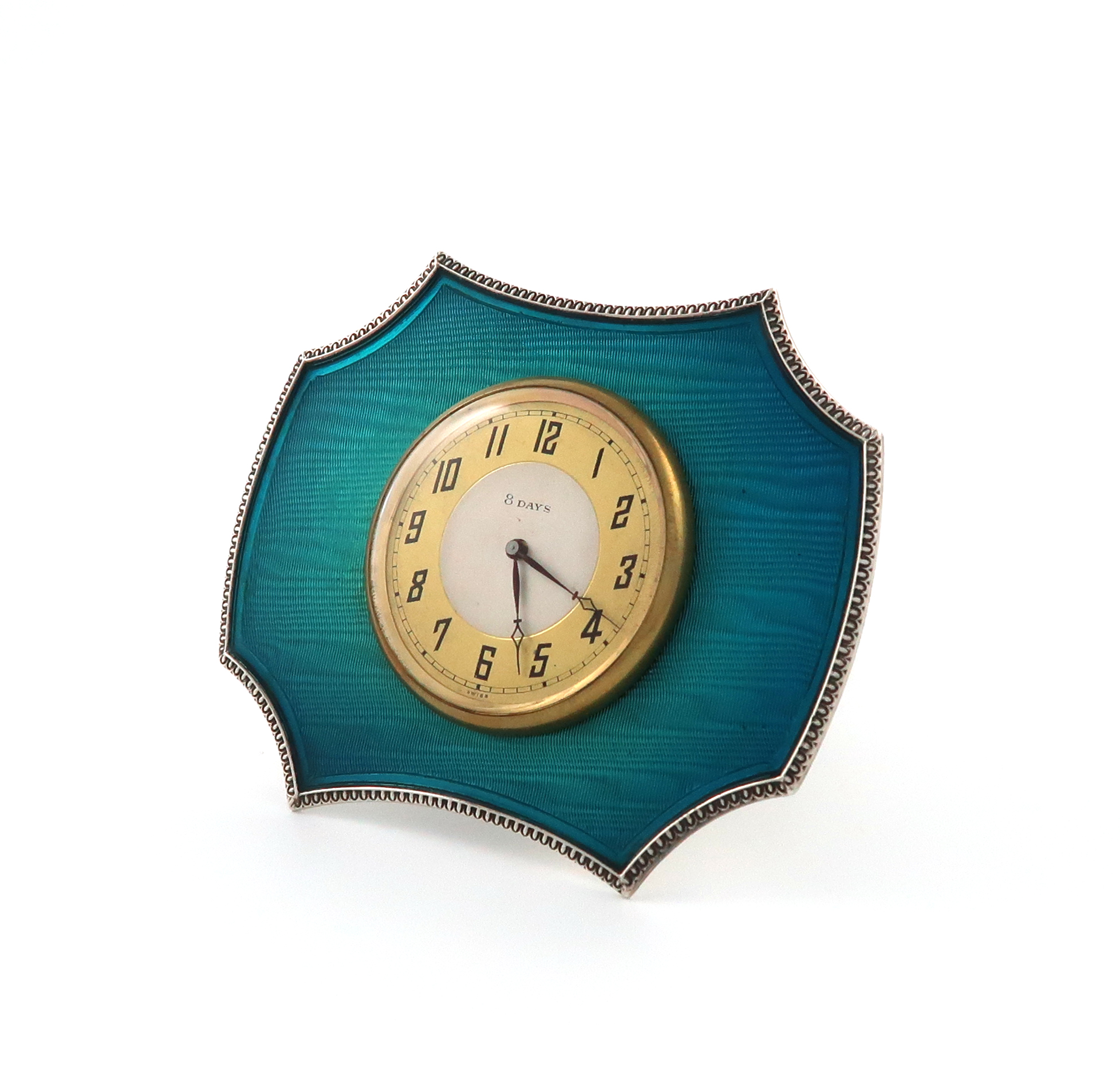 shaped rectangular form, dark turquoise enamel decoration, stylised border, gilt face, brass easel strut, length 11cm.