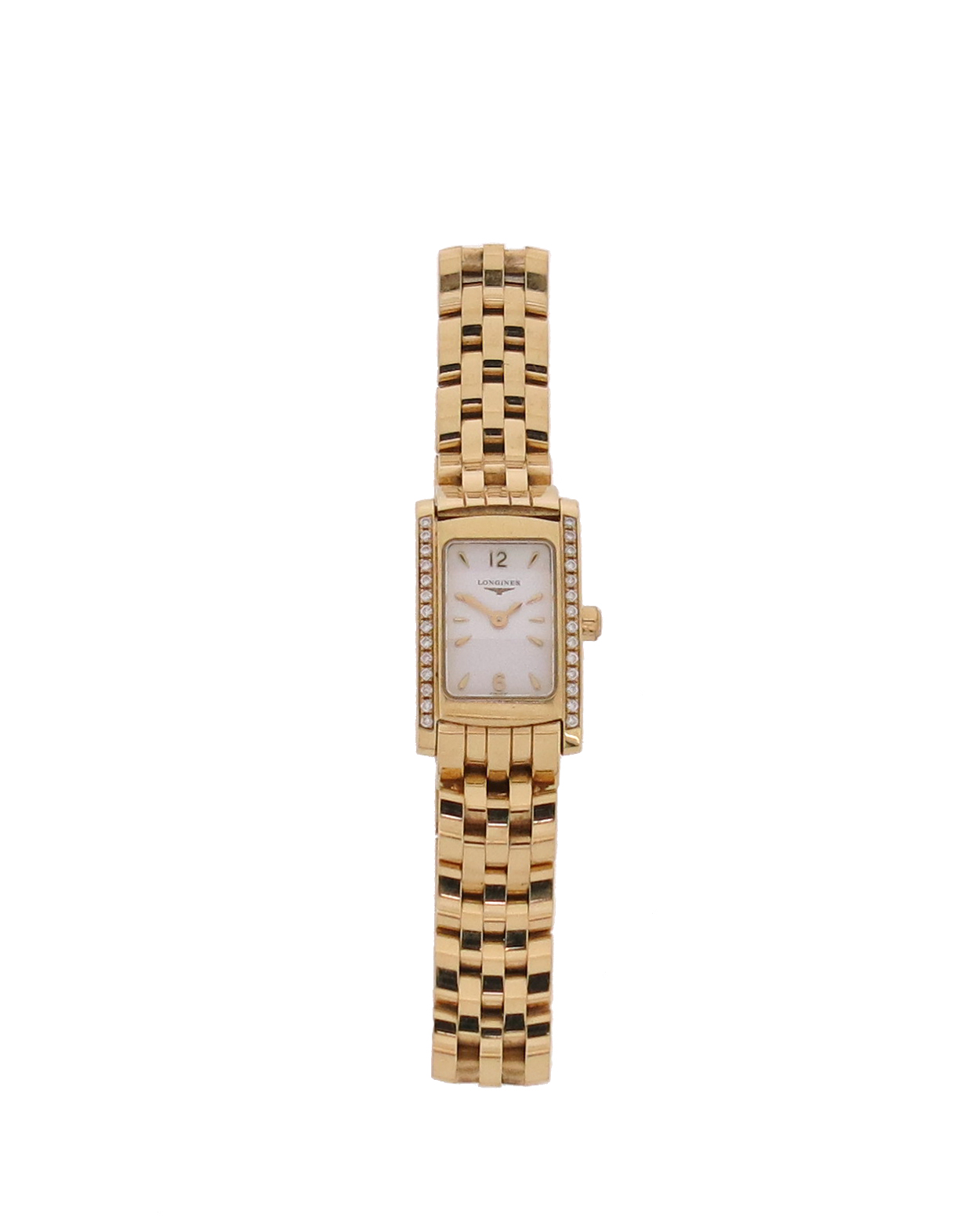A lady's gold wristwatch by Longines, the signed white rectangular dial with Arabic and baton numerals, diamond-set case and brick-link 18ct gold bracelet, deployant clasp, case back numbered 32451945, 1.8cm wide, 17cm long