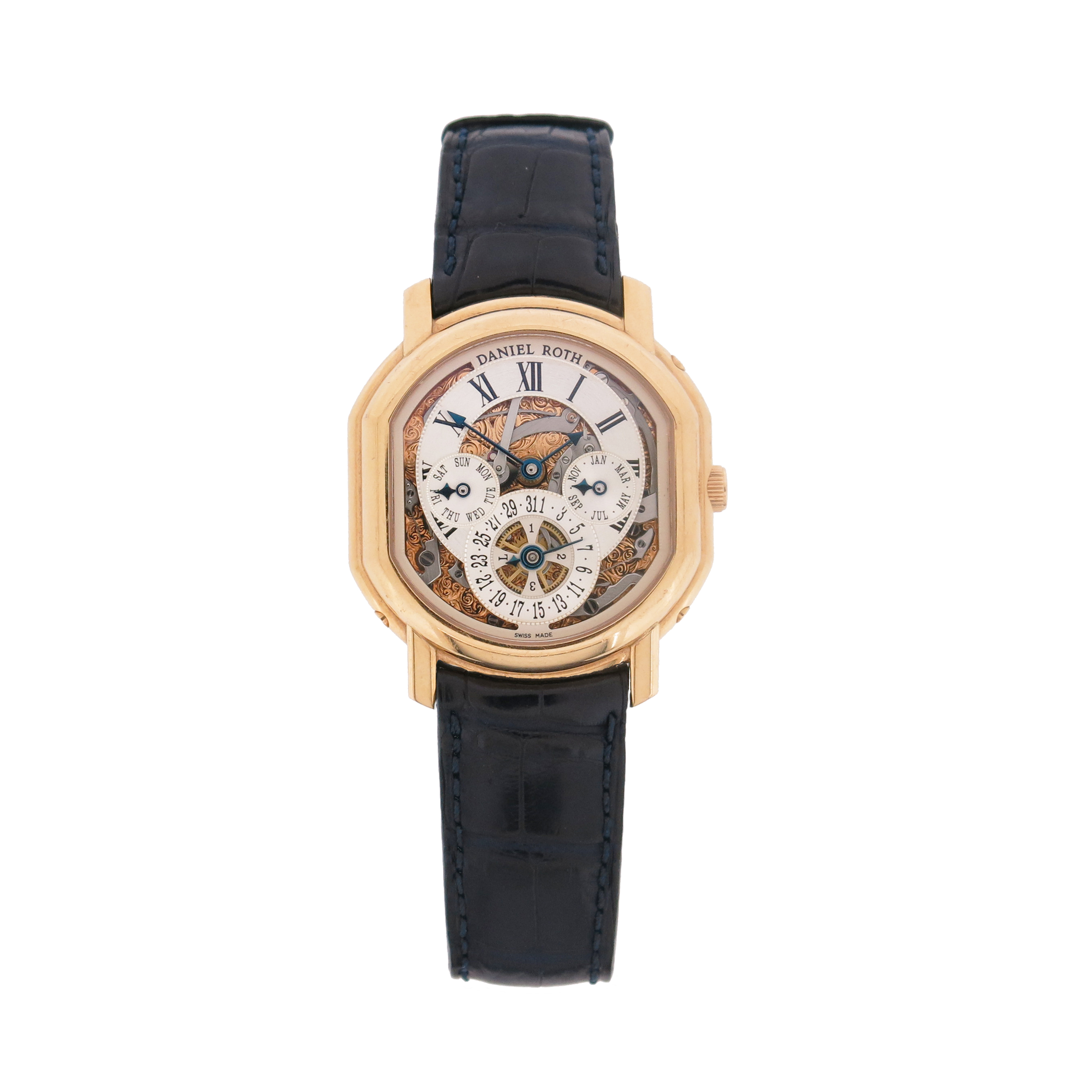 A Gentleman's gold 'Instantaneous' perpetual calendar wristwatch by Daniel Roth, the signed skeletonised dial with black Roman numerals, three subsidiary dials indicating date, day and month, blued steel hands, signed 27 jewel automatic movement, barrel-form case with stepped bezel and skeleton back, caseback signed and numbered 119.X.40. 16301, Numero 33, case 48mm, on a blue leather signed strap with gold buckle clasp, box and papers