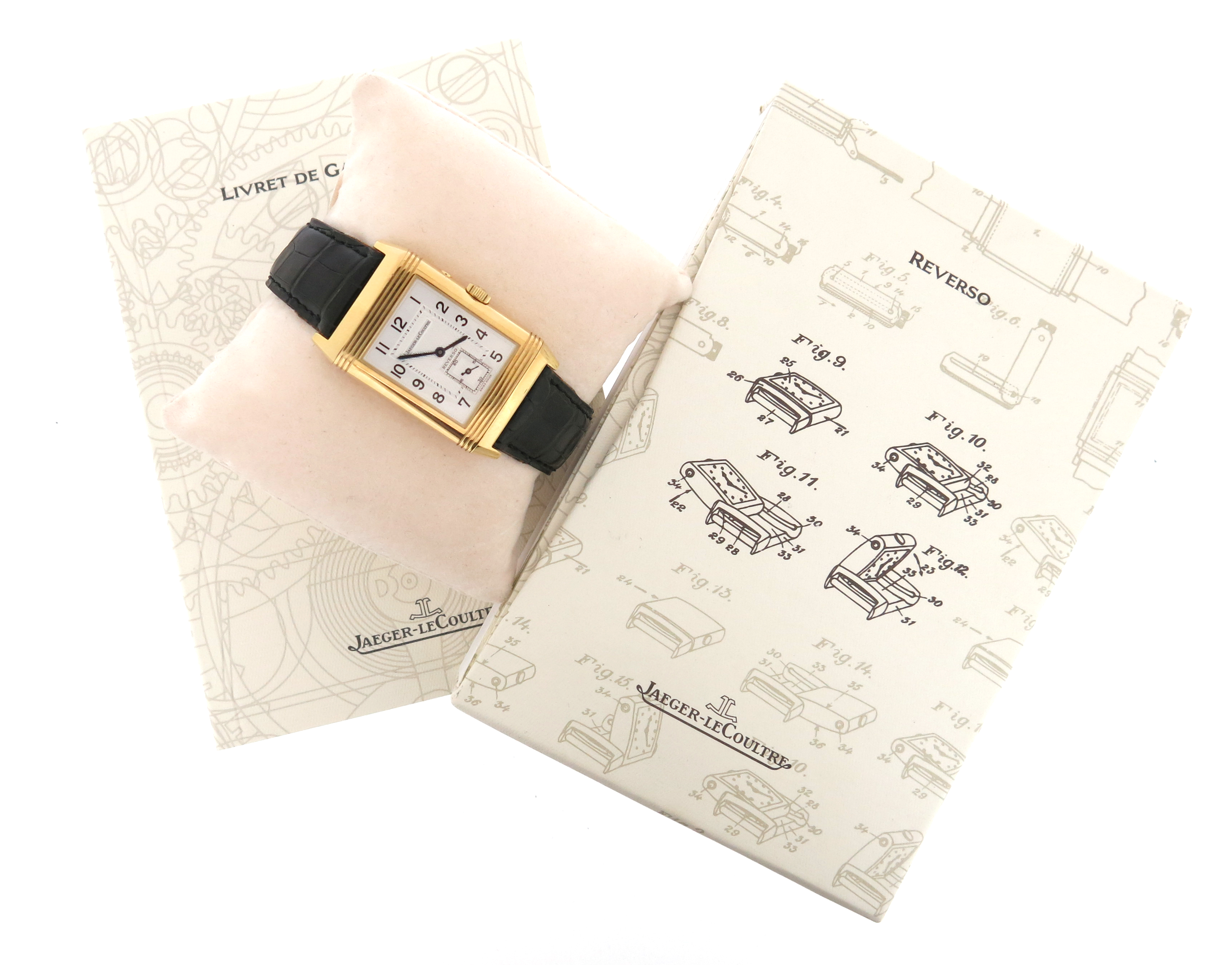 A gentleman's yellow gold Duoface reverso wristwatch by Jaeger LeCoultre, ref 270-1-54, both sides with guilloche decoration to the signed face, different styles of chapter rings and subsidiary seconds dial, manual winding, leather strap with yellow gold Jaeger LeCoultre deployant clasp, case 4.2cm high including lugs, numbered 270154. with box and papers including a fitting instrument