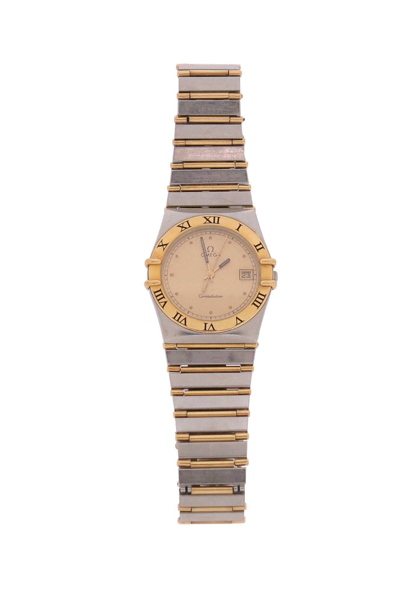 A steel and gold constellation wristwatch by Omega, the signed dial with date aperture at 3 and sweep seconds hand, gold chapter ring with Roman numerals, quartz movement, name and date engraved on the reverse, on gold Omega band with deployant clasp, case 3.2mm wide