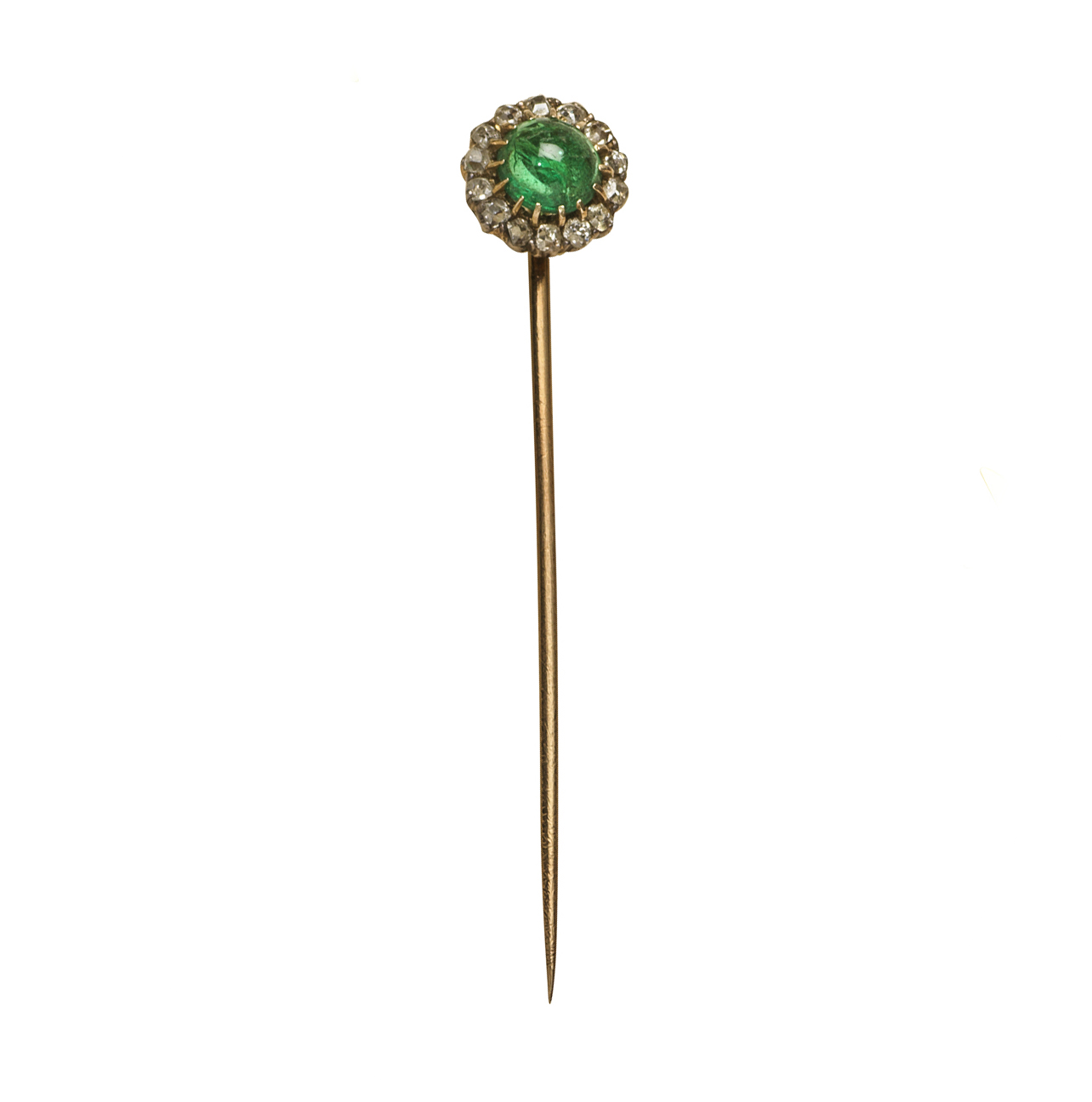 An emerald and diamond stickpin, the cabochon emerald is set within a surround of old cushion-shaped diamonds in silver and gold, 11mm wide, 6cm high