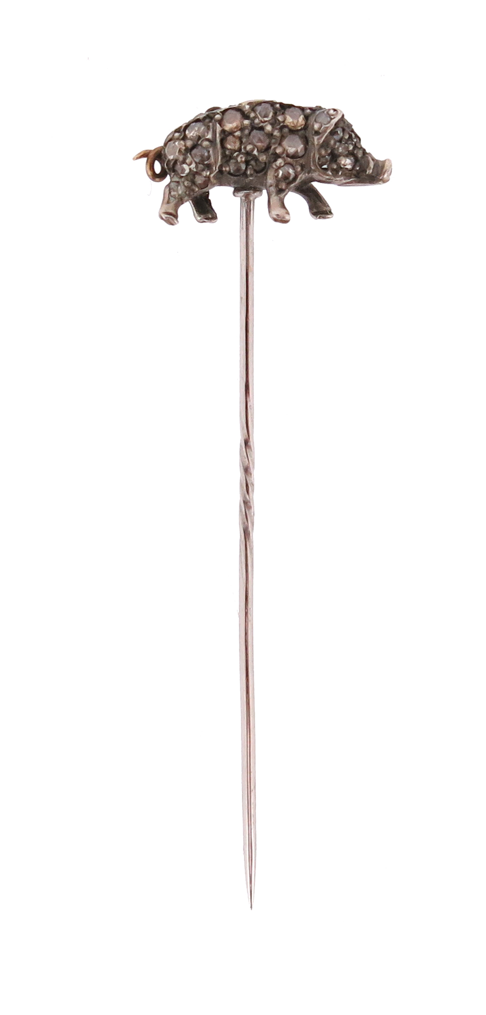 A Victorian diamond-set pig stickpin, the realistically formed pig is pavé-set with diamonds in silver and gold, 2cm wide, 5.8cm high