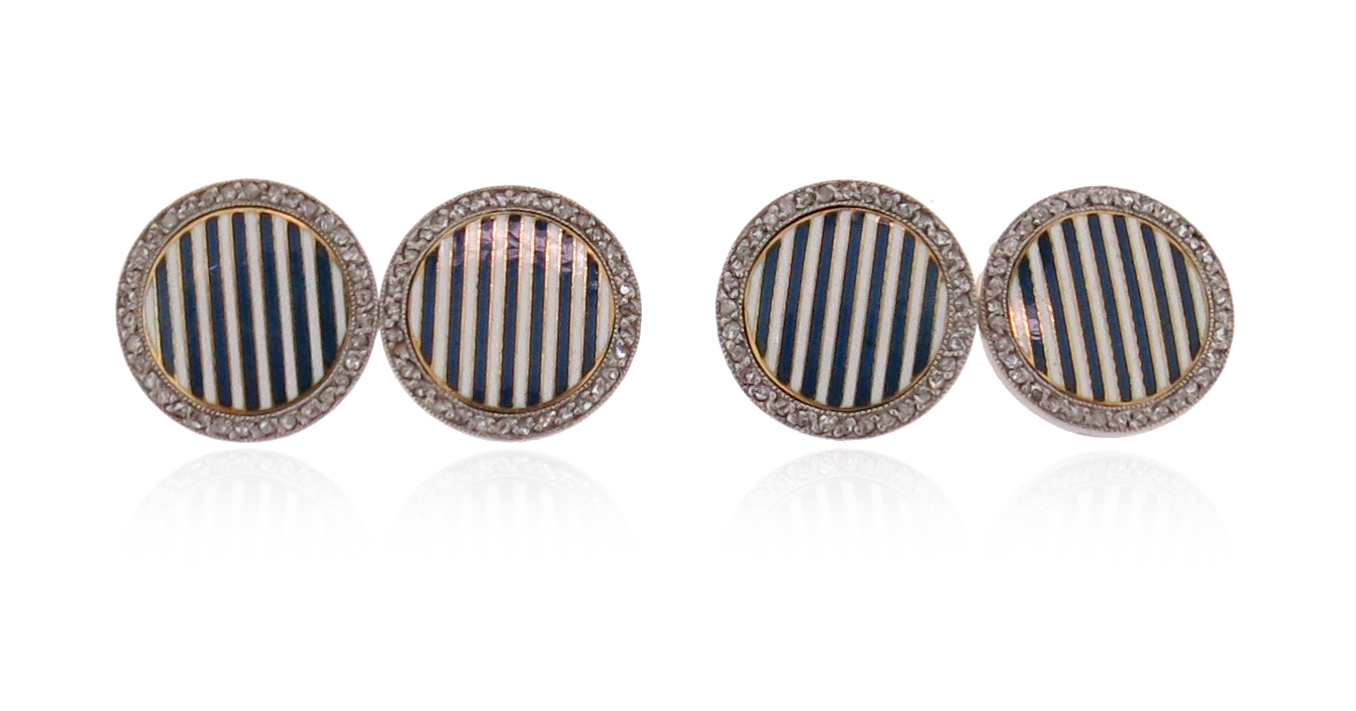A pair of early 20th century diamond and enamel cufflinks by Cartier, the blue and white striped discs set within a surround of rose-cut diamonds in platinum and gold, signed Cartier Paris, with French control marks, each disc 18mm wide