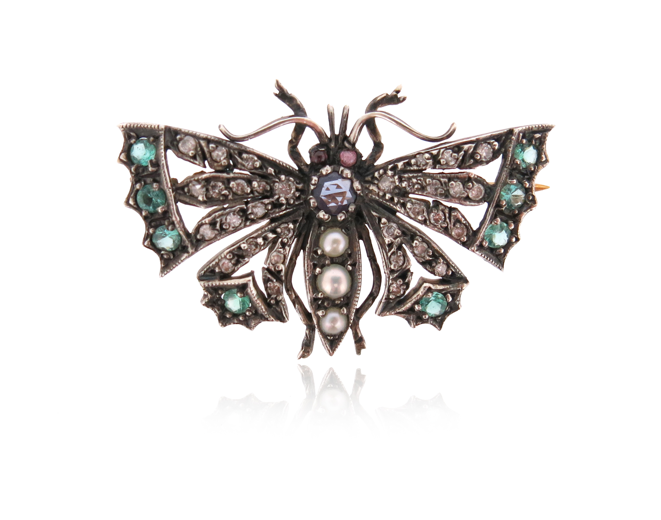 A gem-set butterfly brooch, set with a sapphire and cultured pearl body, ruby eyes and emerald and diamond wings in silver and gold, 4cm wide