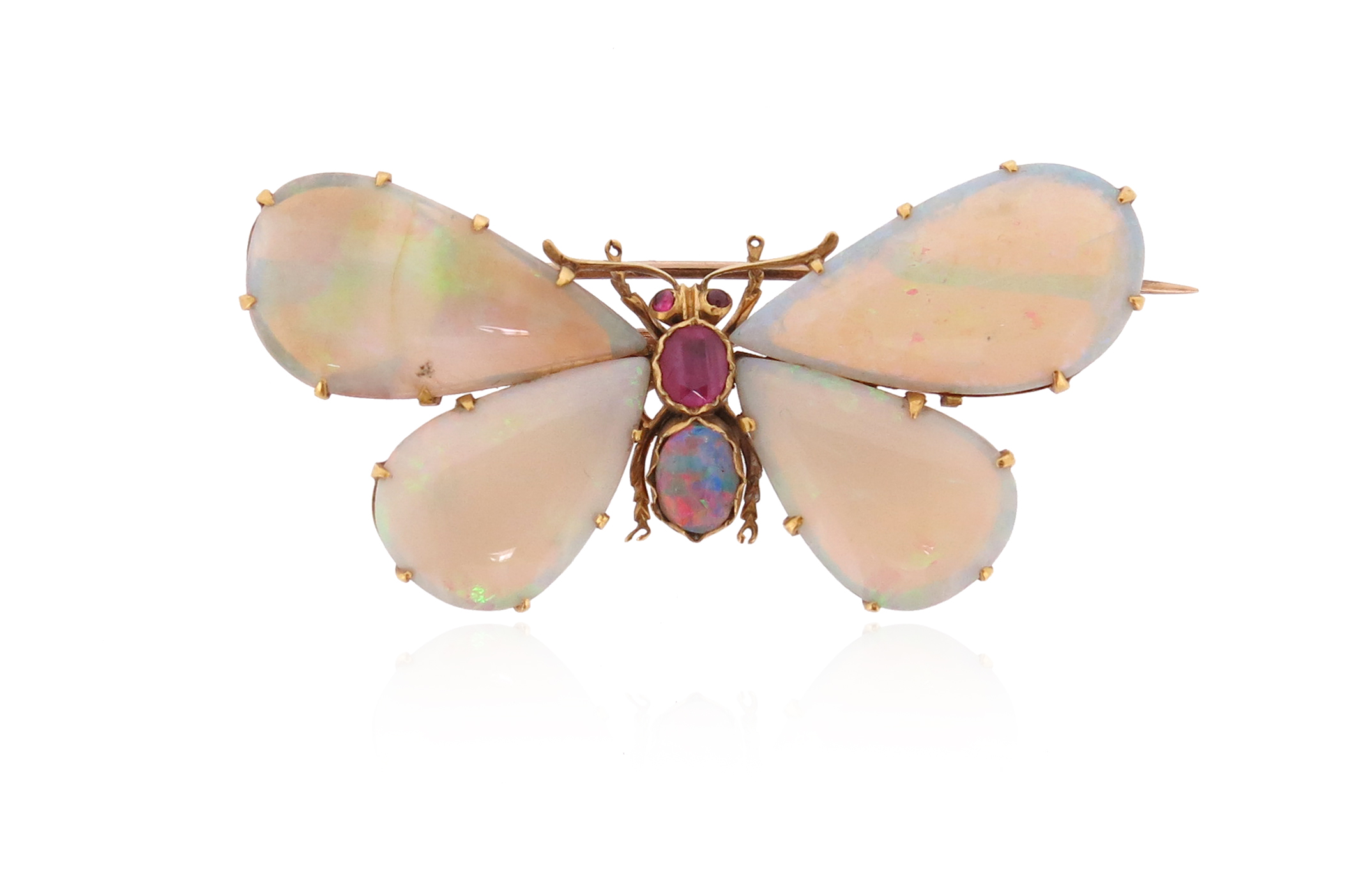 An early 20th century gem-set butterfly brooch, set with solid white opal wings, a ruby and boulder opal body in yellow gold, 6cm wide, case