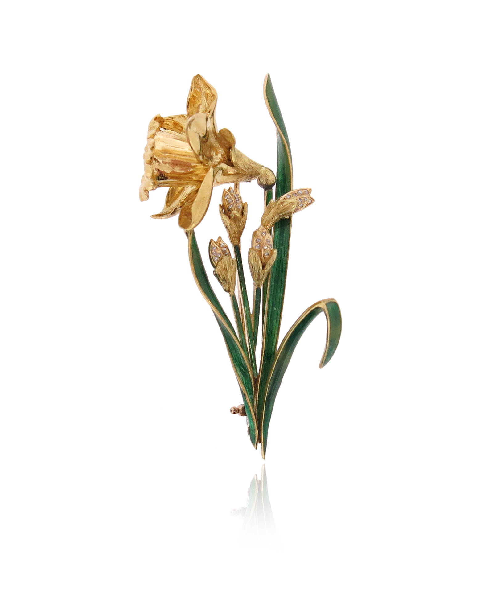A diamond-set gold daffodil brooch, set with circular-cut diamond and with green enamel decoration in gold, 6cm high, case by Garrard