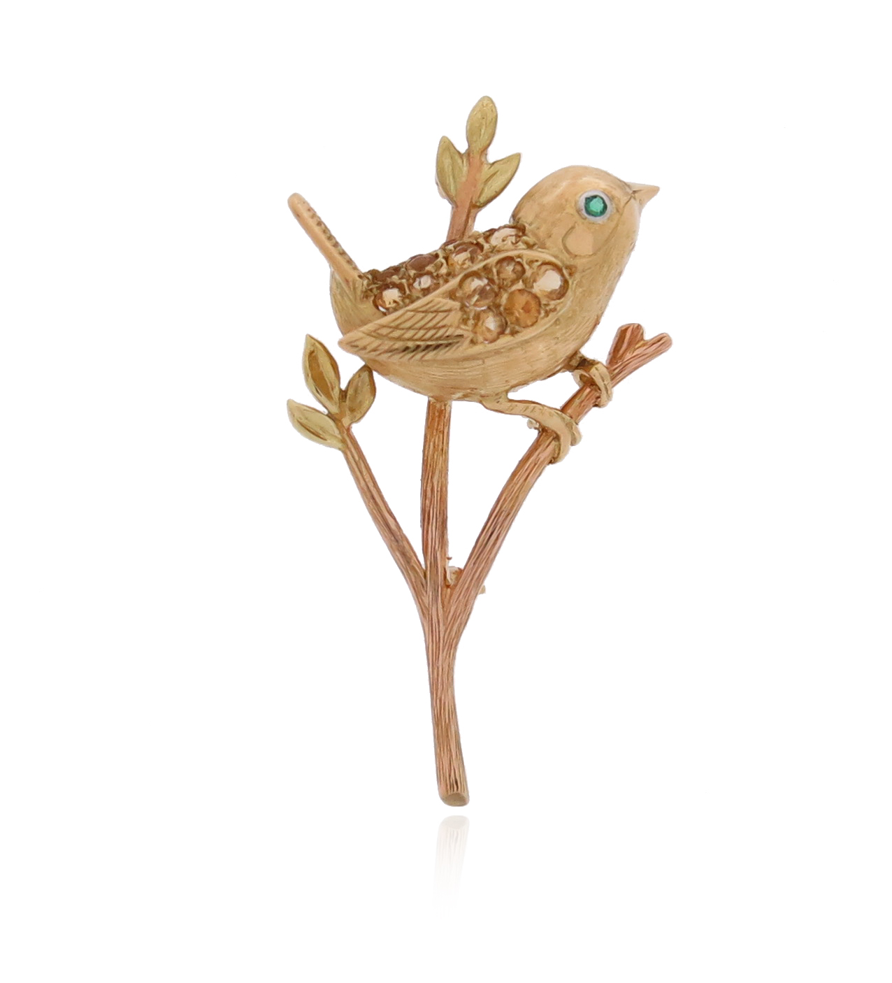 A gold bird brooch, the stylised bird set with citrines and an emerald eye on a bi-colour gold branch, 4cm high