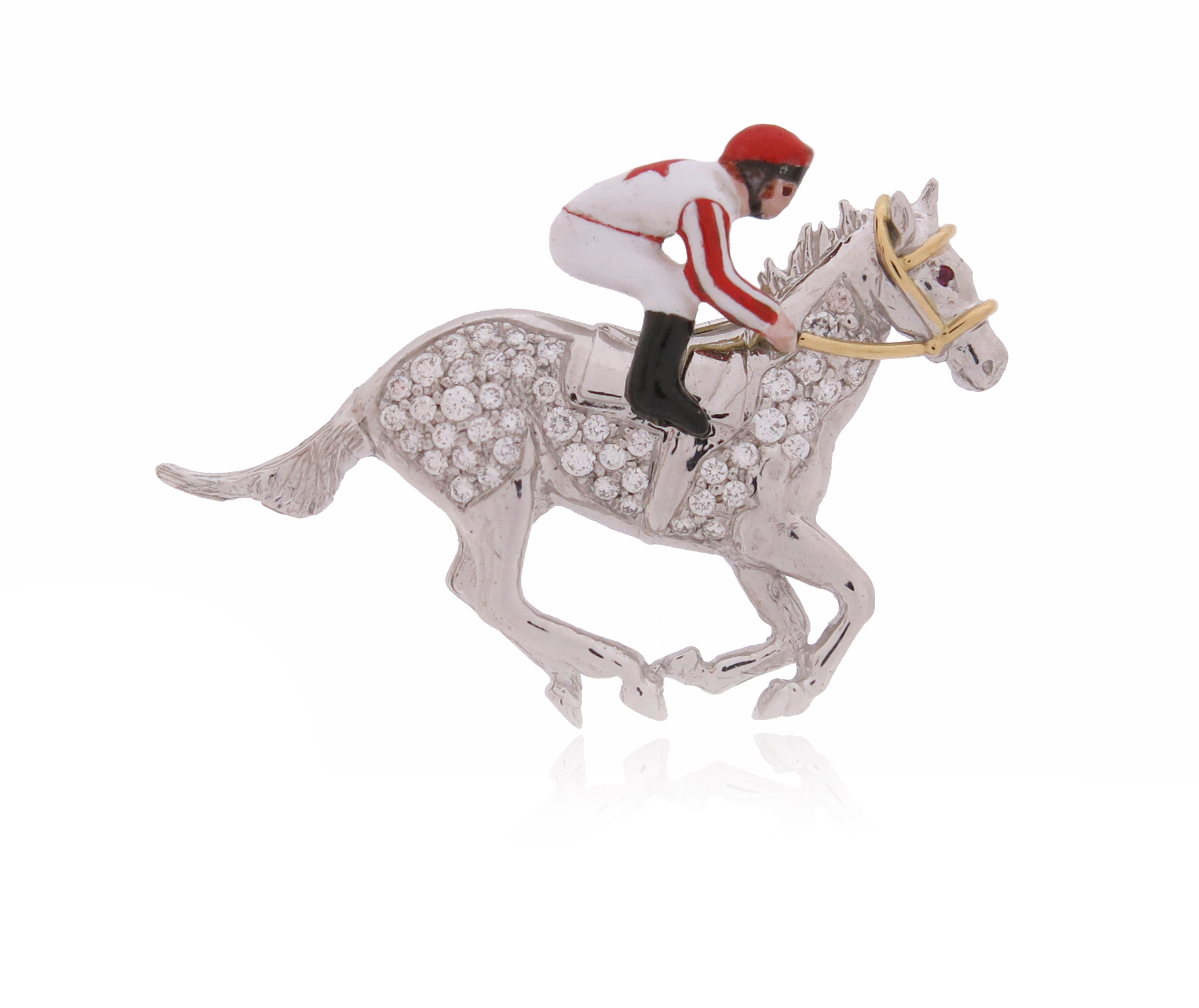A diamond and enamel horse and jockey brooch, the stylised horse is pavé-set with diamonds, the jockey decorated with red and white enamel stripes, in platinum and gold, 4.8cm wide, case