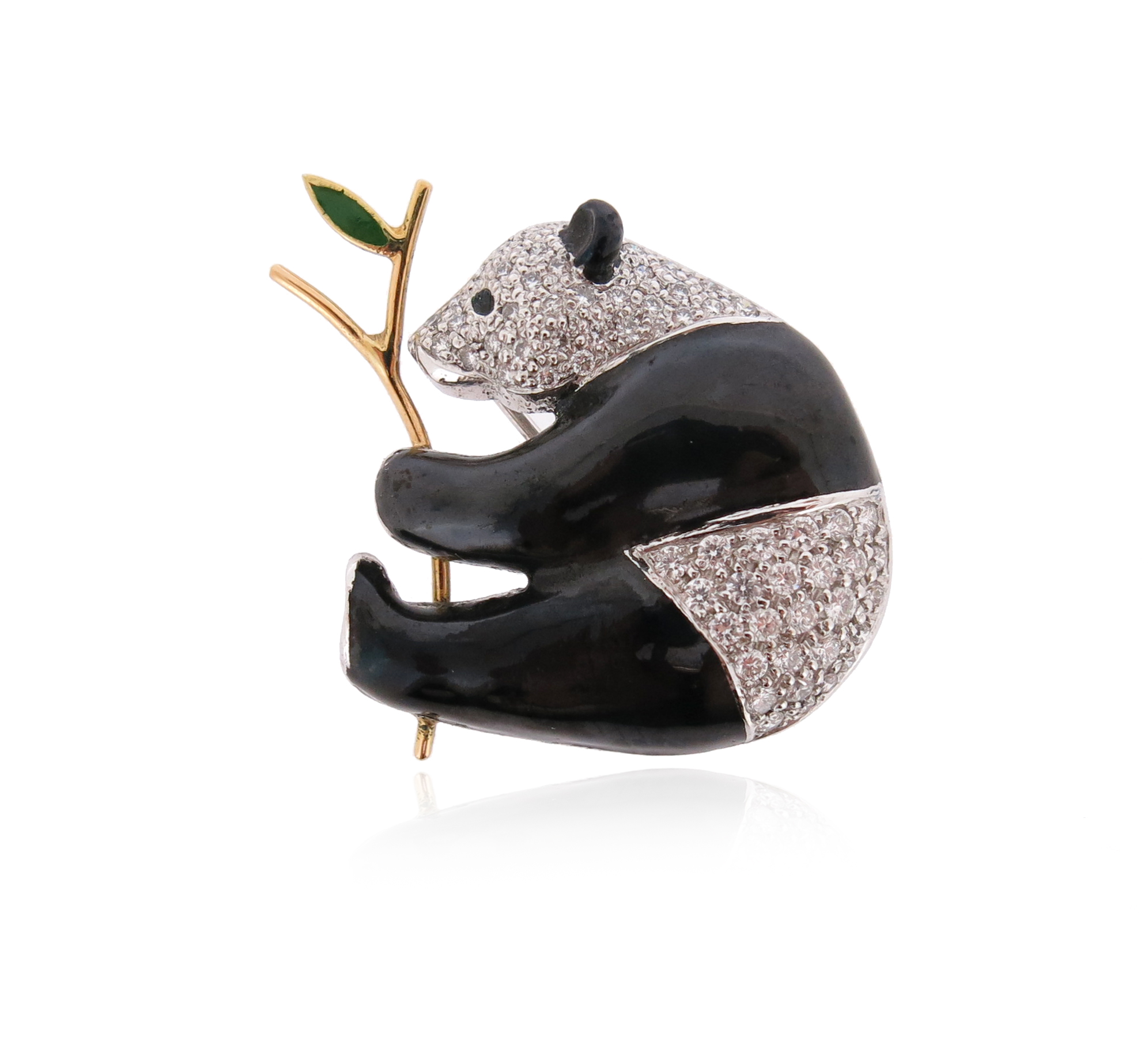 A diamond-set panda brooch, pavé-set with round brilliant-cut diamonds, with black and green enamel decoration in two-colour gold, 3cm high, case