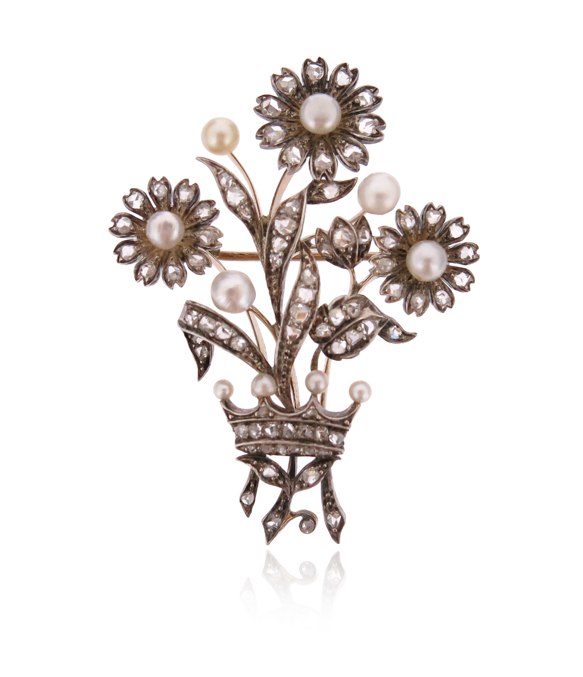 A late 19th century floral brooch, the stylised posy and coronet set with rose-cut diamonds and untested pearls in silver and gold, 5.5cm high