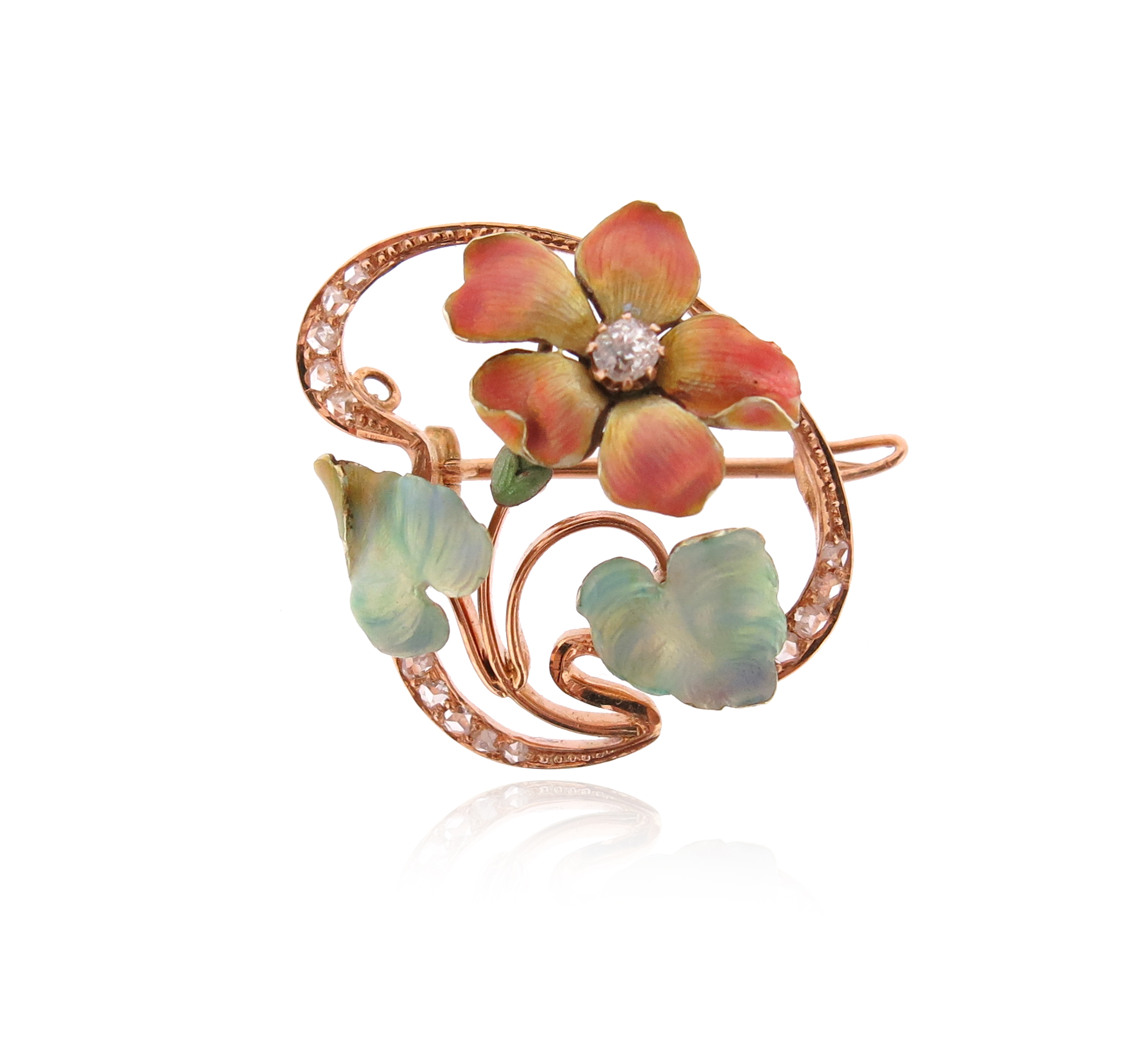 An Art Nouveau diamond-set flower brooch, centred with an old circular-cut diamond, with shaded polychrome enamel decoration, with further rose-cut diamonds to the border, 2.8cm wide