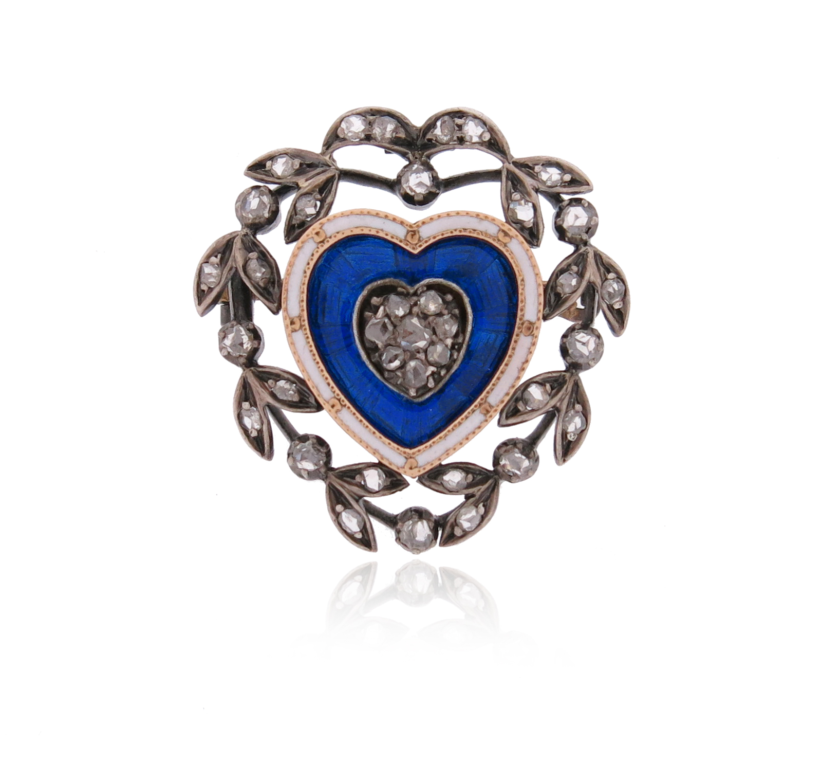 A Victorian diamond and enamel heart brooch, centred with a cluster of rose-cut diamonds within a surround of blue and white enamel decoration, with outer laurel border set with rose-cut diamonds in silver on gold, 2.6cm high