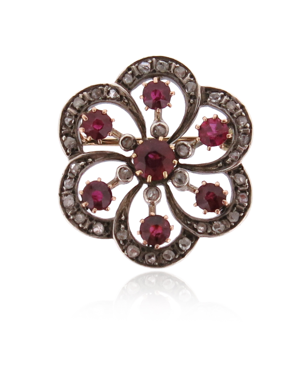 A late 19th century ruby and diamond brooch, the graduated circular-cut rubies set within hexafoil surround set with diamonds in silver and gold, 2.2cm wide