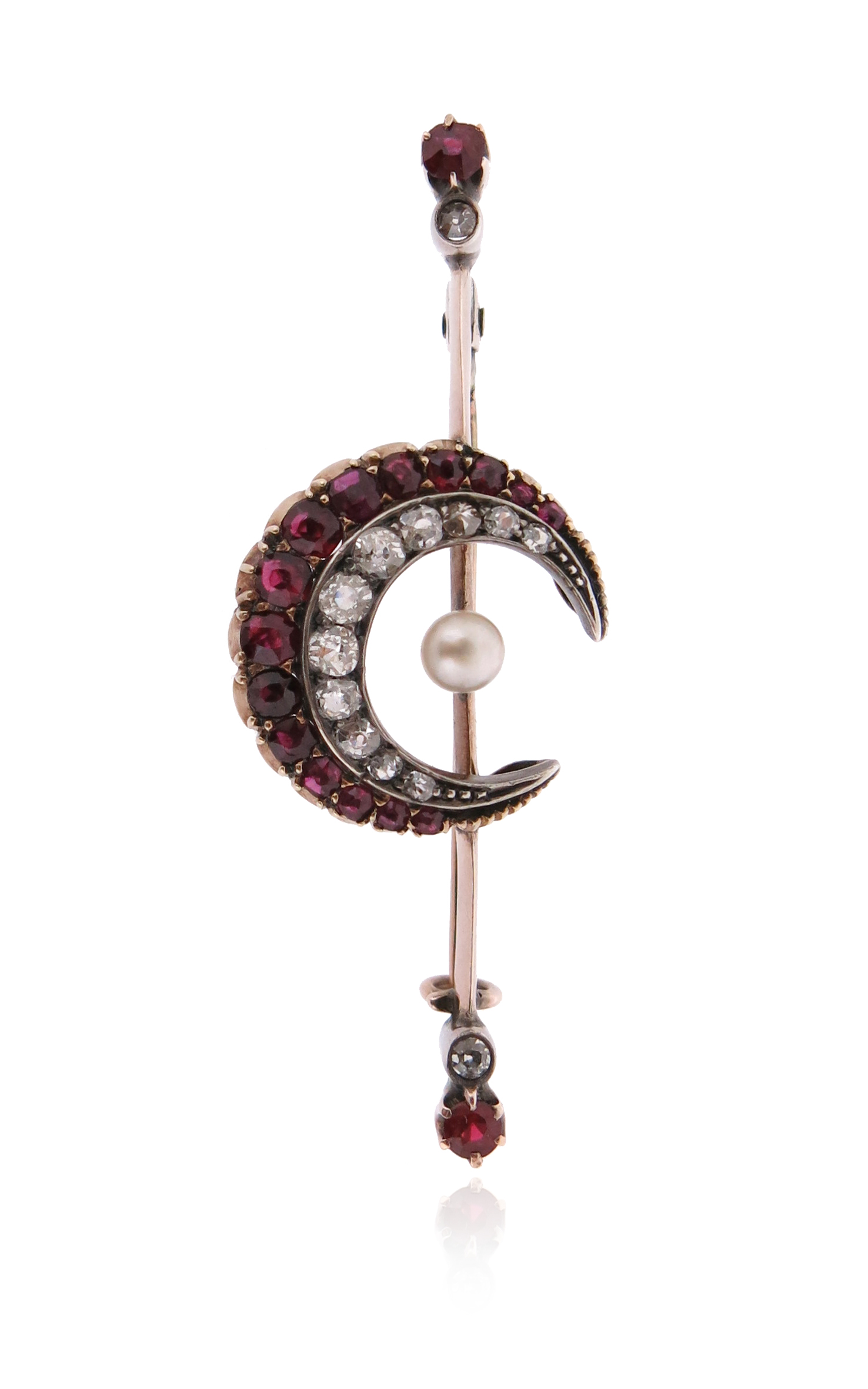 A Victorian ruby and diamond crescent brooch, set with graduated rubies and diamonds and a seed pearl on a gold bar brooch with ruby terminals in silver and gold, 5.2cm wide