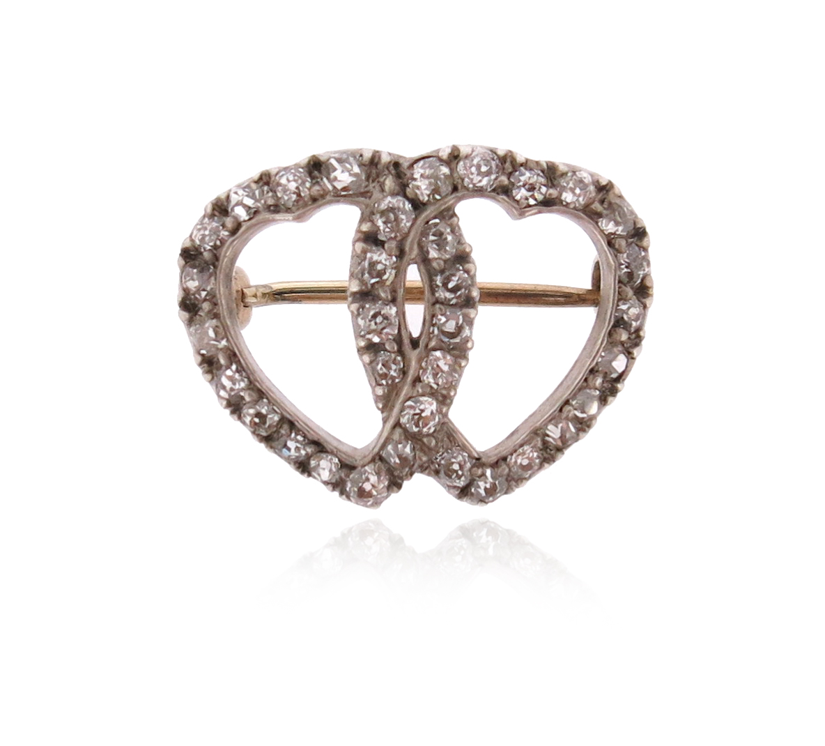 A Victorian diamond-set double heart brooch, set with old circular-cut diamonds in silver on gold, 2cm wide
